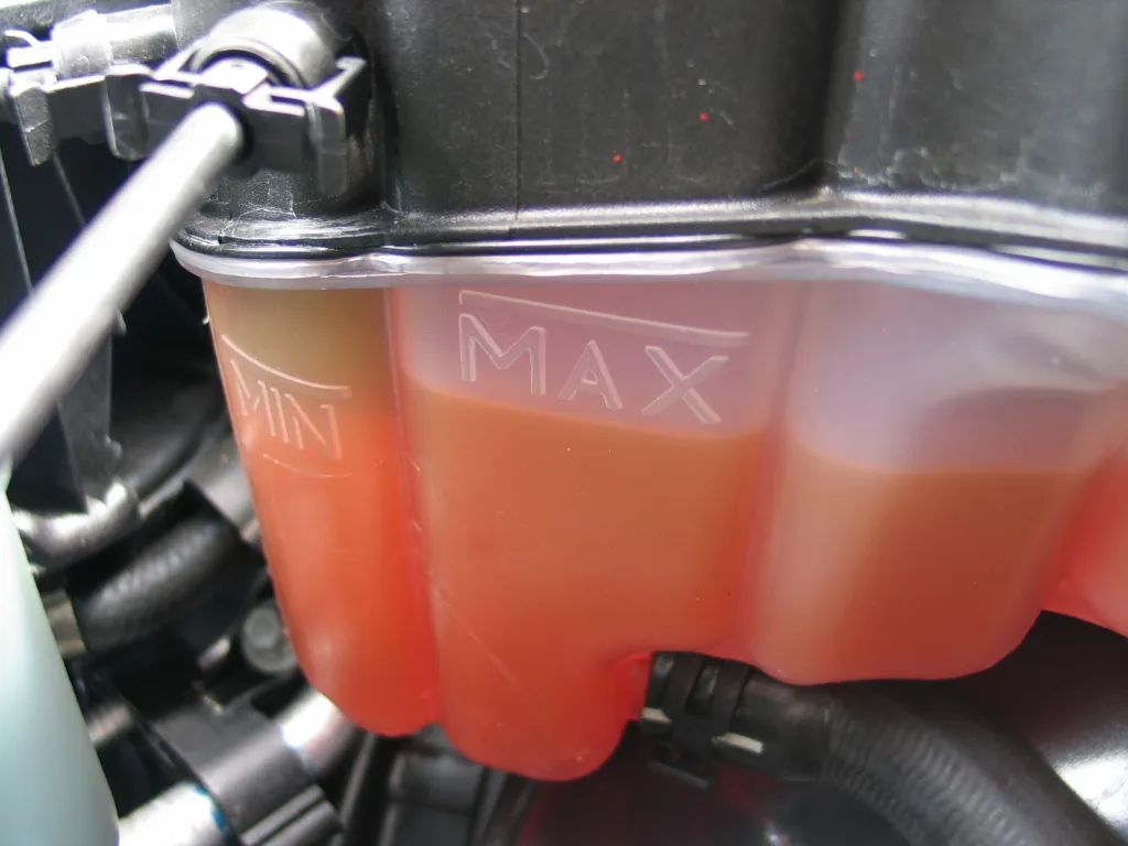 ich bin mir nicht sicher, wie der Kühlmittelstand im Ausgleichsbehälter korrekt abgelesen wird. Da gibt es in der ersten Kammer eine MIN Markierung und in der zweiten Kammer eine MAX Markierung. Der Kühlwasserstand befindet sich leicht unterhalb der MAX Markierung in der zweiten Kammer. Also eigentlich alles ok.