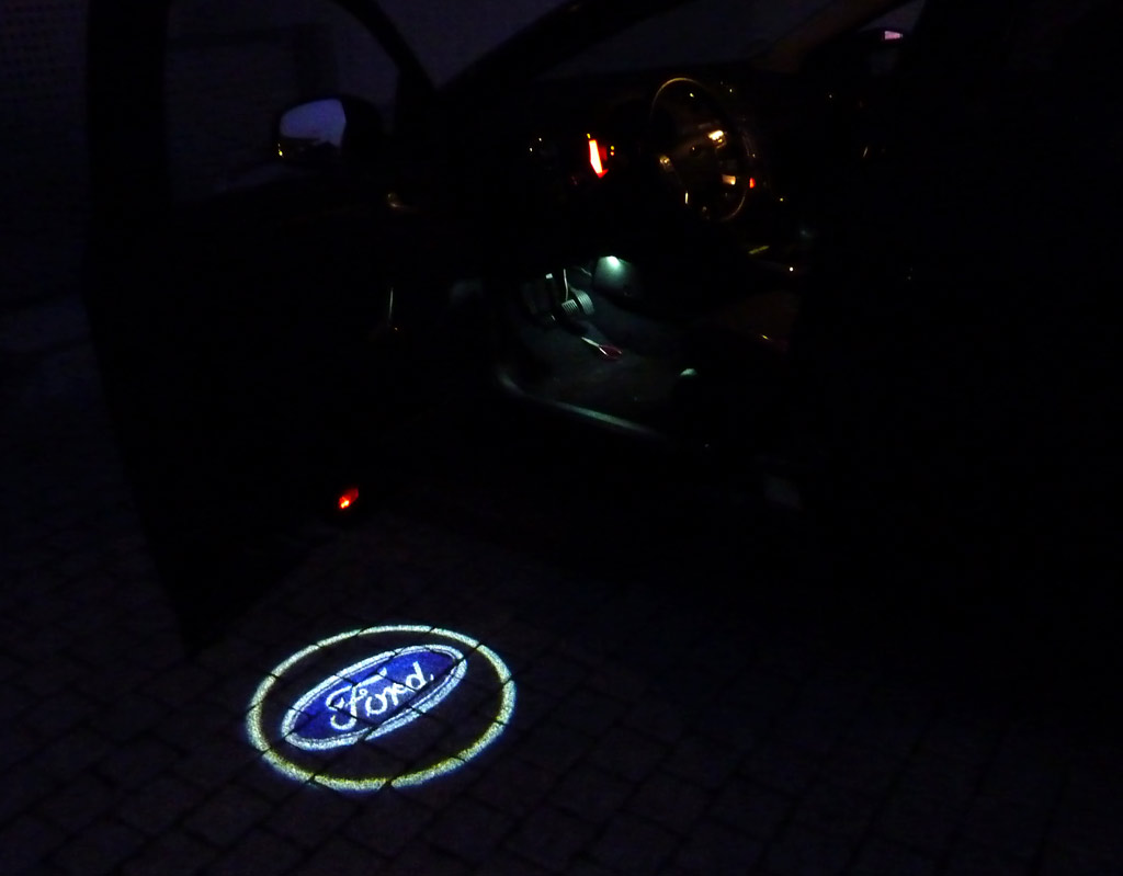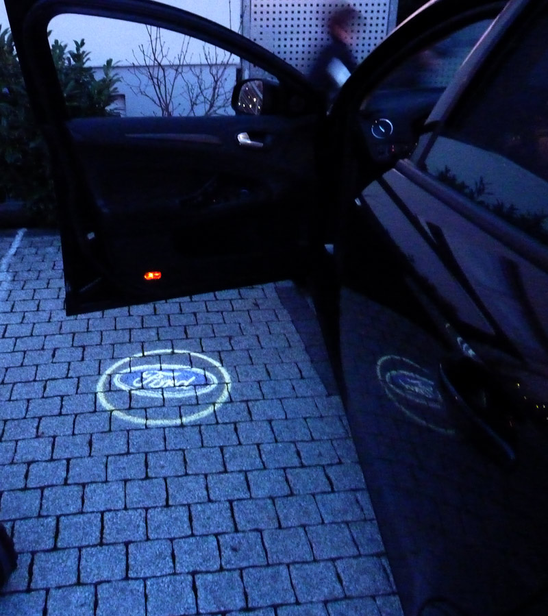 Nachdem ich mit einem Durchgangsprüfer genau die Kabel ermittelt hatte, die von der Lampenfassung der Umfeldbeleuchtung an dem Stecker hinter der Türverkleidung ankommen (nur zwei Kabel hatten Durchgang), habe ich die Logolights genau an den Kabeln angeschlossen. Auf der Fahrerseite leuchtete das Logo dann auch synchron mit der Umfeldbeleuchtung: Alles war gut - zunächst!