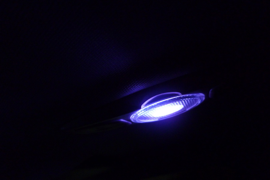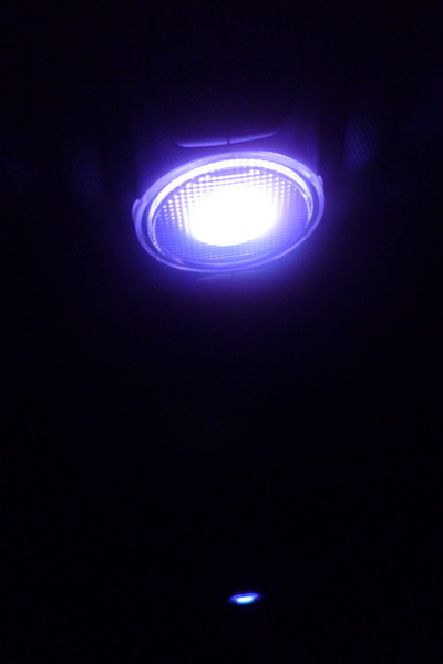 Hier sind nun meine Bilder vom Einbau der Logo-Lights, auch welche von Fußraum- und Deckenbeleuchtung in blau. Da die LEDs der Deckenbeleuchtung auf die Platine eingelötet sind und sich nicht tauschen lassen, habe ich mit blauem Transparenzpapier gearbeitet, welches ich in 2 Lagen direkt über den LEDs mit Tesa befestigt habe.