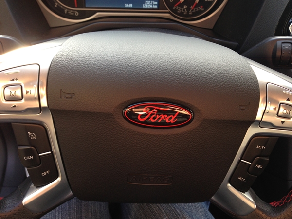 - rot/schwarze Ford-Pflaume auf Lenkrad