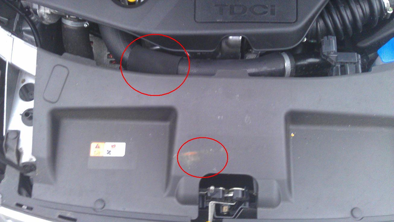 Ich habe mal ein Bild gemacht und das Stück Gewebe makiert und auch die Stelle, wo die Haltestange für die Motorhaube auf der Kunststoffabdeckung scheuert.