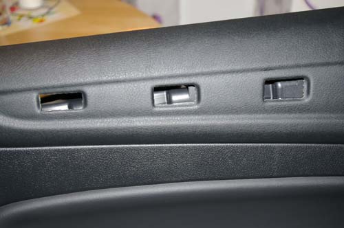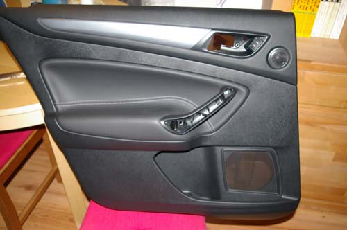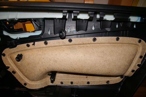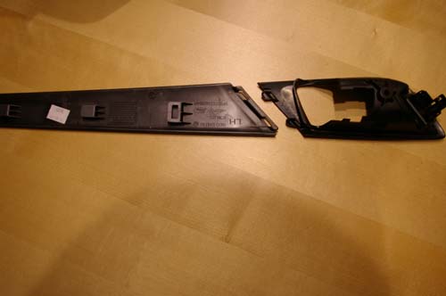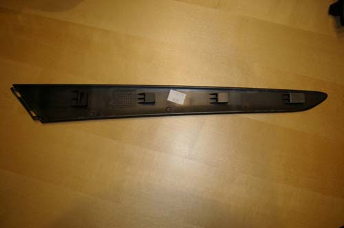 Rückseite der Türpappe, hier die Schalter für den Fensterheber raus, dann die Griffmulde und jetzt von hinten die erste Haltenase der Kunsstoffschiene anheben und die Schiene in Richtung Griffmulde schieben und schon ist sie draußen!