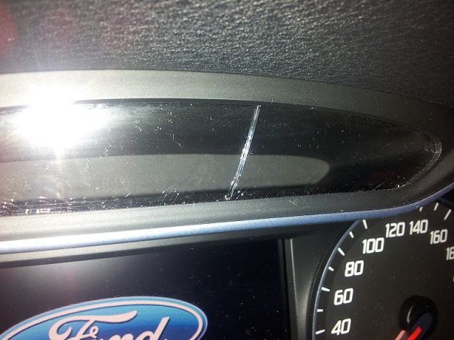 im Sommer letzten Jahres ist mir während einer längeren Fahrt (von Süd-Baden zur Nordsee) aufgefallen, dass der Mondeo plötzlich zwei Risse im Tachoglas hat. Auch die kleine Scheibe bei den Anzeigen darüber ist komplett durchgerissen. Als ich wieder in der Heimat war, habe ich das dem Händler natürlich gezeigt und wir haben uns darauf geeinigt, dass wir das beim nächsten Service angehen.