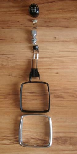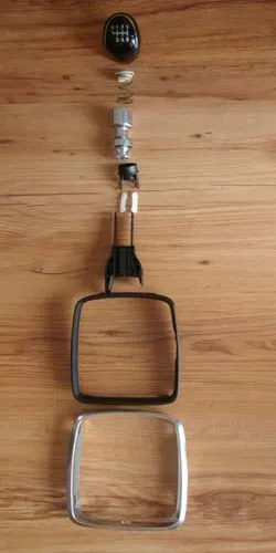 Nun müßt ihr den Chromring den man immer zieht für die Schaltarretierung noch demontieren. Ihr trennt erst einmal die ganz Plastikarretierung für die Schaltbox. Diese seitlichen Stängchen aus Plastik sind einfach mit kleinen Kunststoffteilchen verbunden. Einfach drehen und ihr habt sie in der Hand. Jetzt noch die Plastikhülze mit einem Schraubendreher oder Messer ( so habee ich es gemacht) ein bisschen aufspreizen und mit ein wenig Gewalt von der Chromhülze trennen. Diese zwei Hülzen Klemmen den Schaltsack an der oberen Schaltarretierung ein. Nun habe ich noch die Tackerklammern am Plastikrahmen aufgebogen und entfernt und alles fertig!