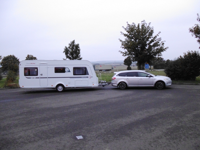 Ganz schönes Schiff, dein Wohnwagen. Der Mondeo hat ja etwa 4,8 m Länge, aber den kannst du dahinter problemlos verstecken. Was wiegt der so in vollem Urlaubstrim?