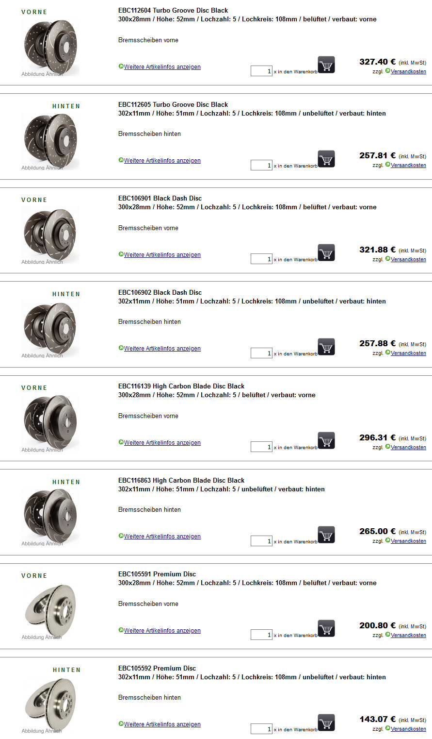 • Ich fahre seit Jahren ausschließlich Original Ford (also FoMoco und nicht das qualitativ minderwertige Motorcraft-Klumb) und bin eigentlich zufrieden. Ja, es kostet gut doppelt so viel wie Brembo, Zimmermann, aber sooo oft muss das ja auch nicht neu.