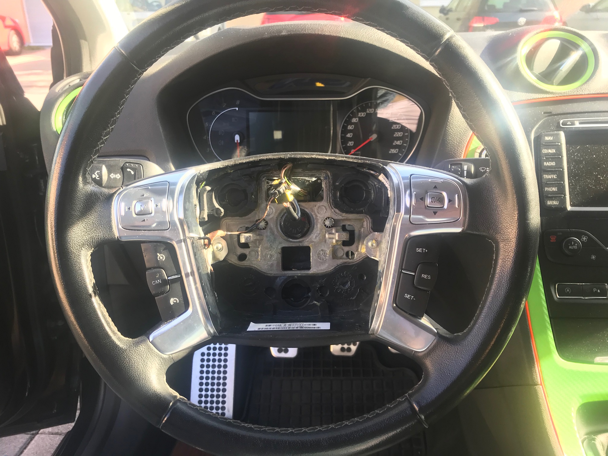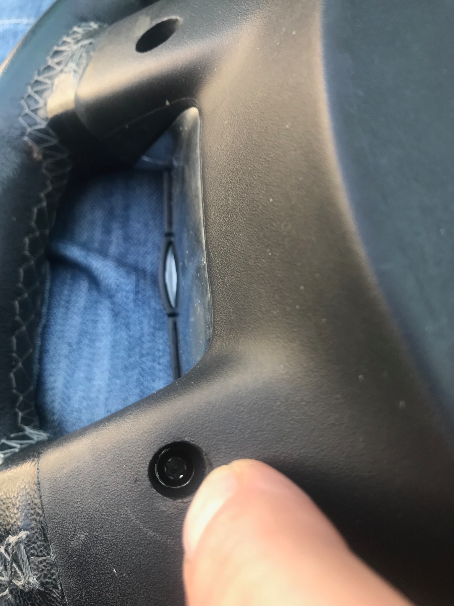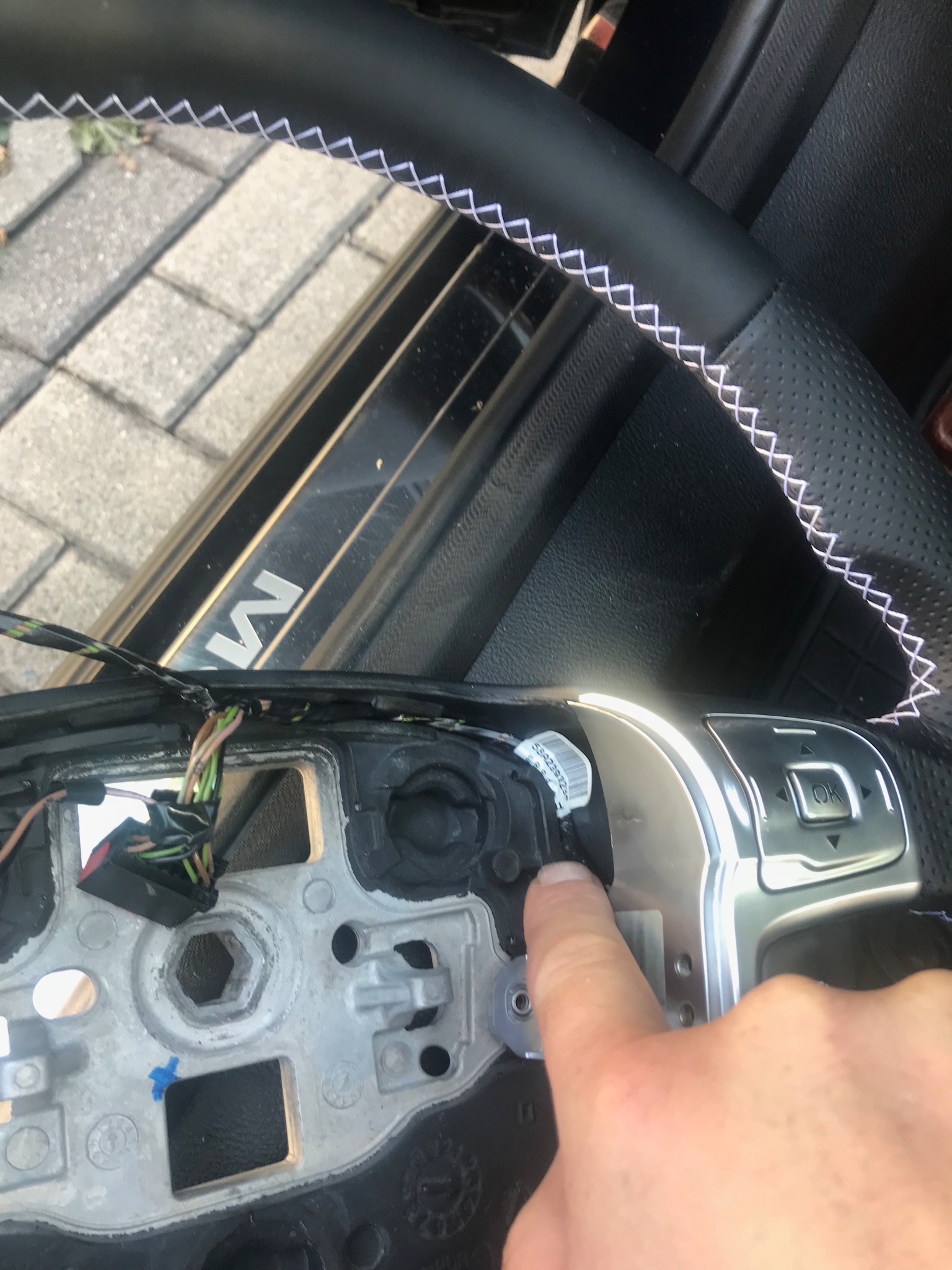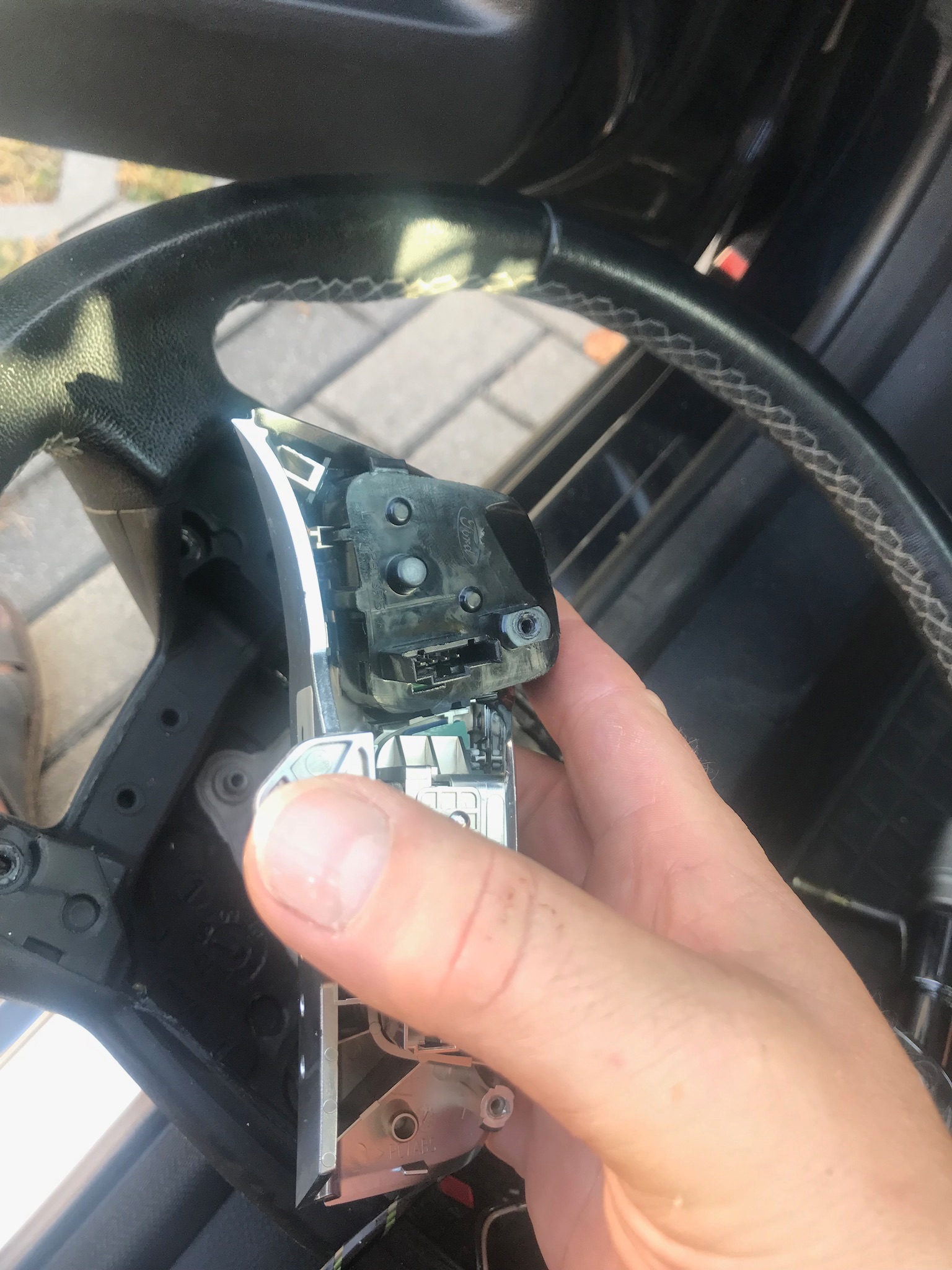 - Toxschrauben im Lenkrad lösen und die 2 Torxschrauben jeweils auf der rechten und linken Rückseite um die Tastenkombination zu entfernen, Kabel aus dem Lenkrad lösen