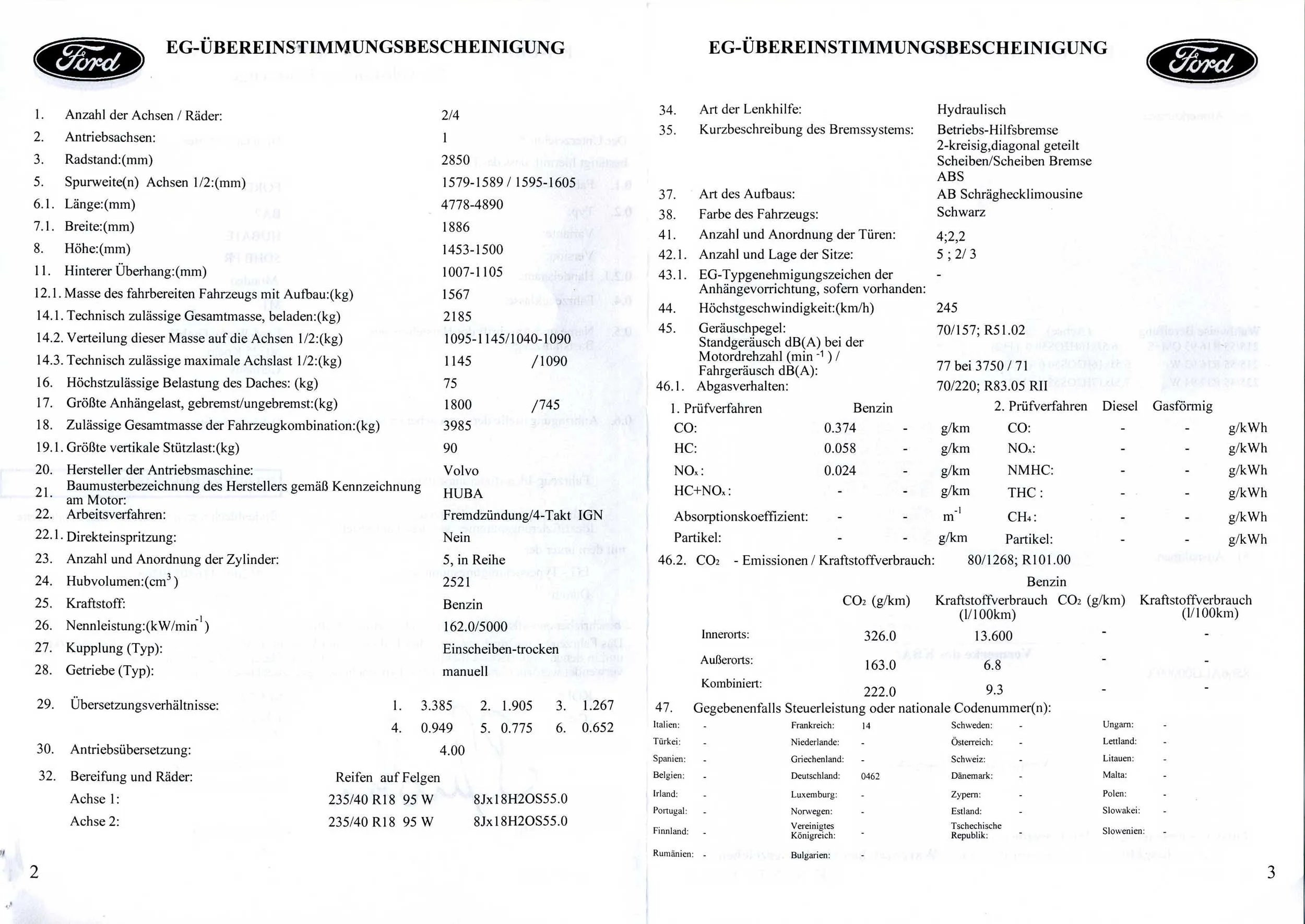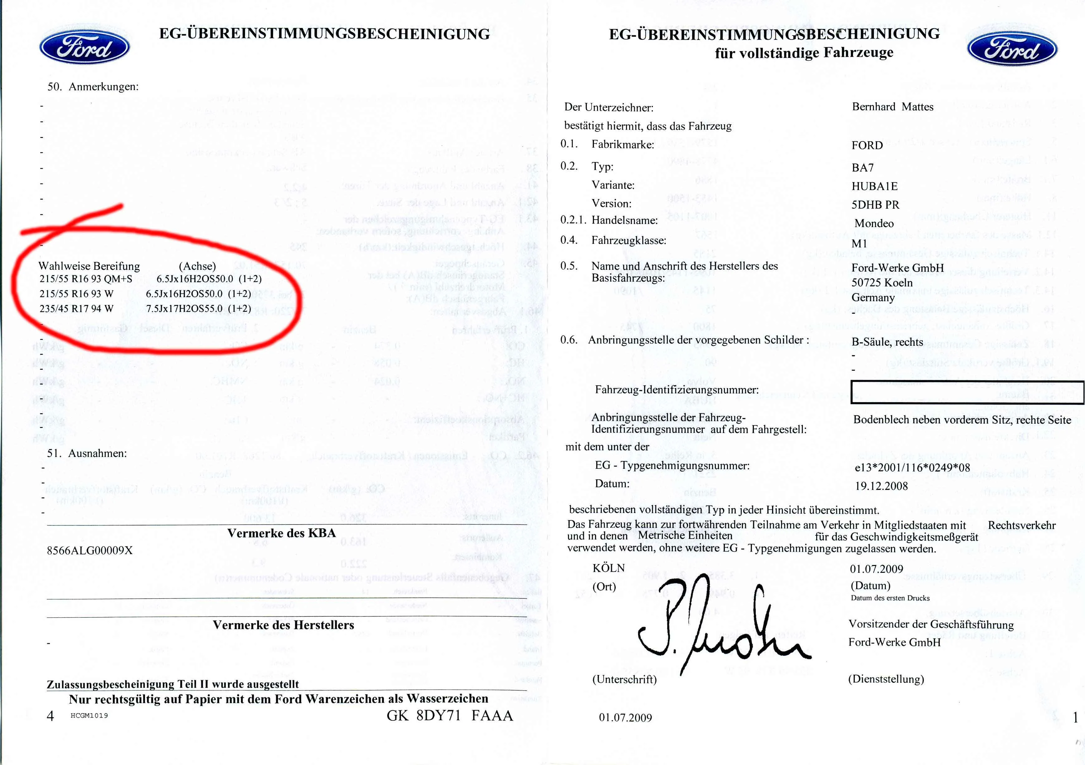 • Im Fahrzeugschein steht glaub ich nur die kleinste, zulässige Reifengröße. Wichtig ist das CoC- Dokument, das die abweichenden, von Ford