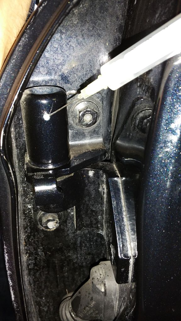 Ich hab bei dem Scharnier fahrertür nur ein Loch gebohrt ca.10 mm von der oberkante( waagerecht) und hab sprühfett reingemacht,und das knacken ist weck