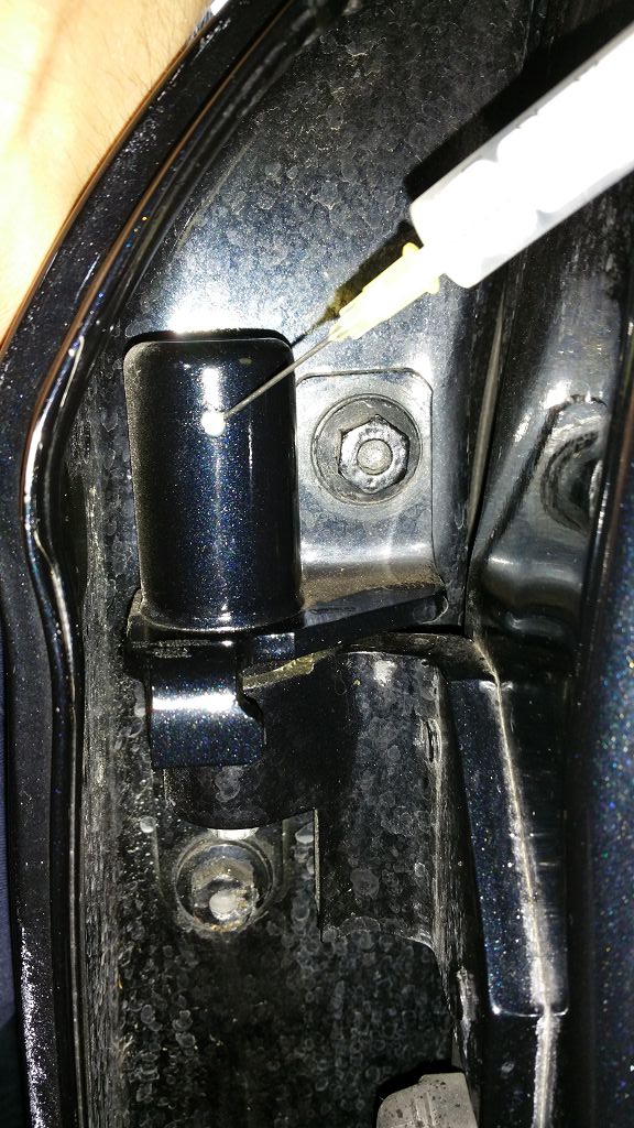 Ich beschreibe mal mein Vorgehen.......türschanier hinten li. Und re. Knacken........hintere Türen sind zu Fahrer und beifahrertür sind auf.......nun auf den Schweller gesetzt Blick nach hinten auf das obere Scharnier akkuschrauber zur Hand mit einem 3mm Bohrer und ein Loch in das Scharnier gebohrt ca 10 mm von der unterkante,es läuft eine Flüssigkeit aus(sah aus wie rostlöser,flüssig wie Öl,war aber nur links der Fall) so und dann noch ein Loch ca 10mm von oben in das Scharnier gebohrt