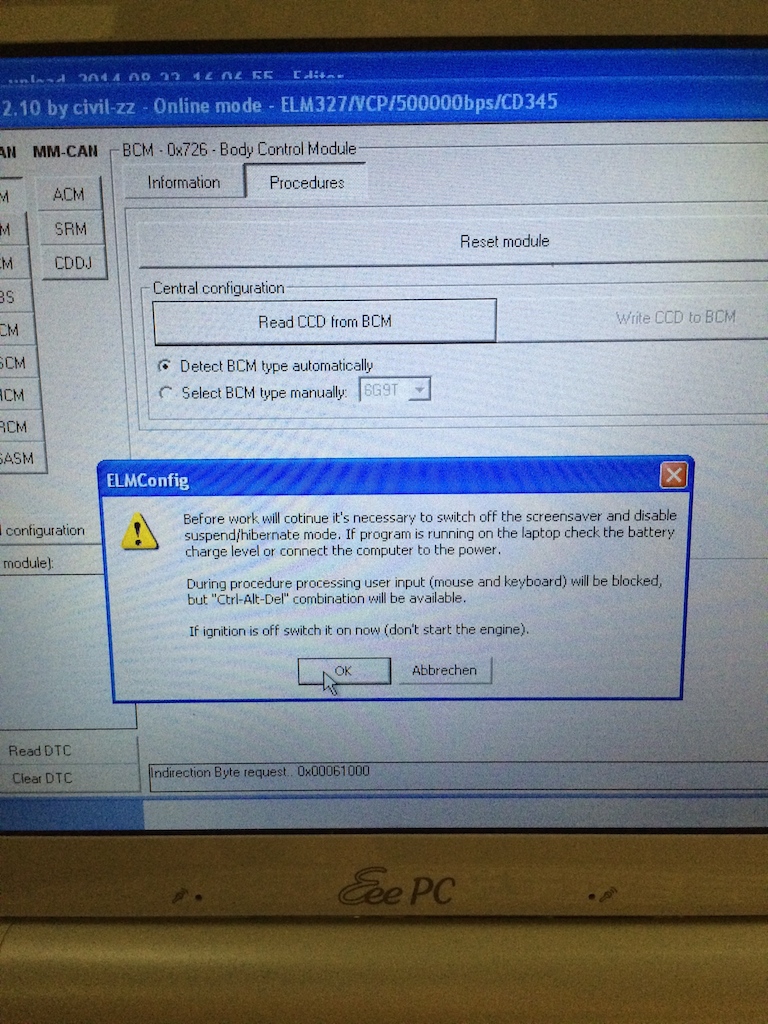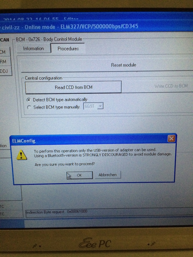 4)Procedures ausgewählt und READ CCD from BCM. Es kommen zwei Warnhinweise und das Convers blinkt wie ein Weihnachtsbaum.