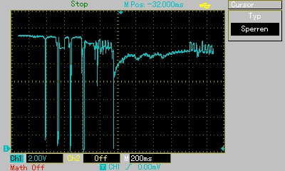 Es hat dann gleich 5 * Tick tick gemacht, und dann ist er angesprungen. Das Bild zeigt aber während der Ticks Spannungseinbrüche gg. 0V