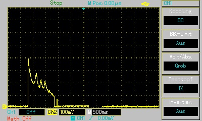 Habe ich mir gedacht, ich könnte mal zwischen diesen beiden Punkten den Spannungsabfall mit dem Oszi anschauen. Und Siehe da. Treffer. Ich habe dort den Spannungsabfall (siehe Bild)