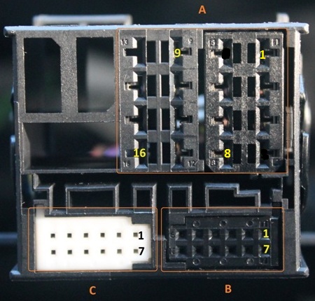 Block A Pin 1 bis 8 sind die Zuleitungen zu den Lautsprechern. Block B enthält die Anschlüsse für die LFB, Cd-Wechsler (falls vorhanden) usw und in Block C sind die Anschlüsse für die AUX-Klinkenbuchse und die Bez. c32D usw. das müssten eigentlich die Bezeichnungen für die jeweiligen Stromkreise sein. Und Pin 16 im Block A ist nicht belegt, da war früher das Zündungsplus dran.