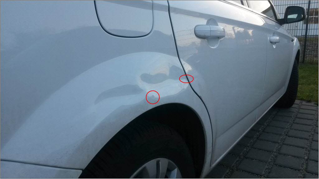 Wegen der Unregelmäßigkeit der Delle, und zwei kleinen Lack-Abplatzern ist mit Smart Repar nicht mehr viel zu machen.