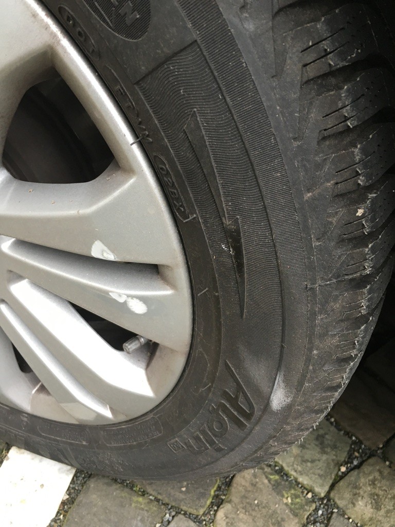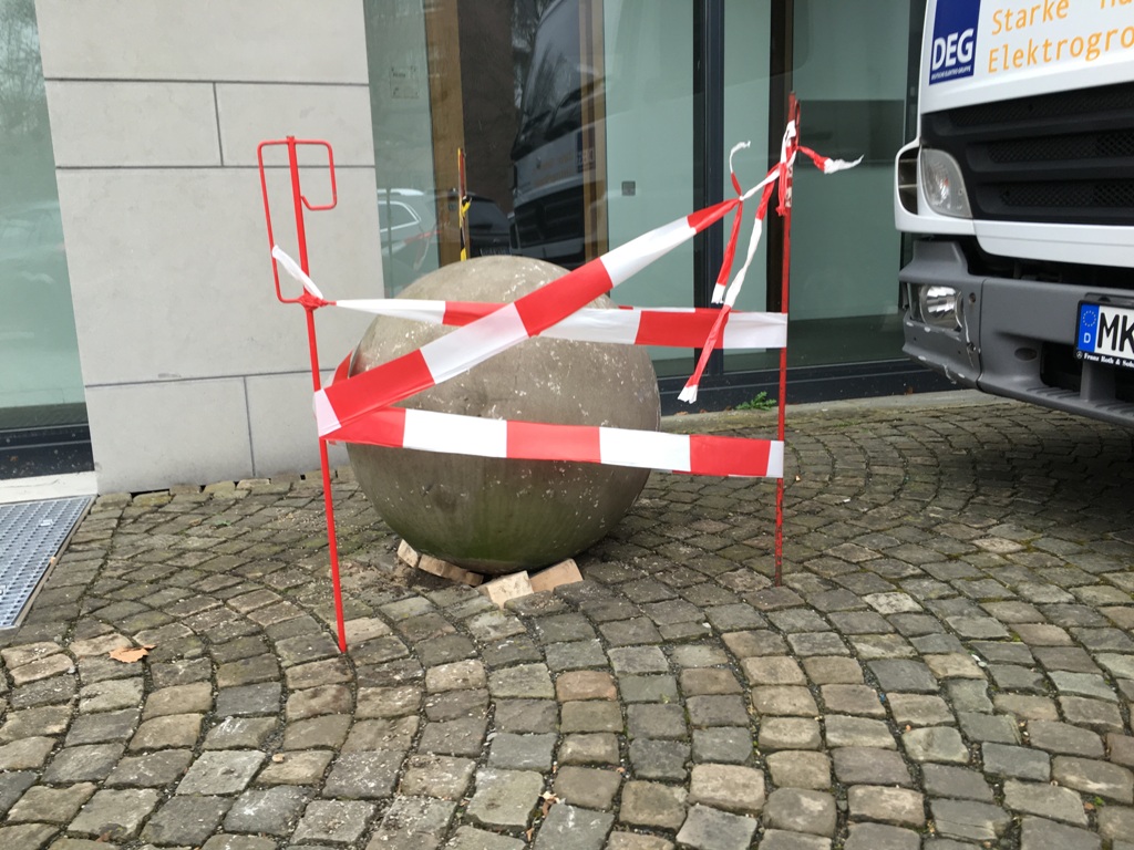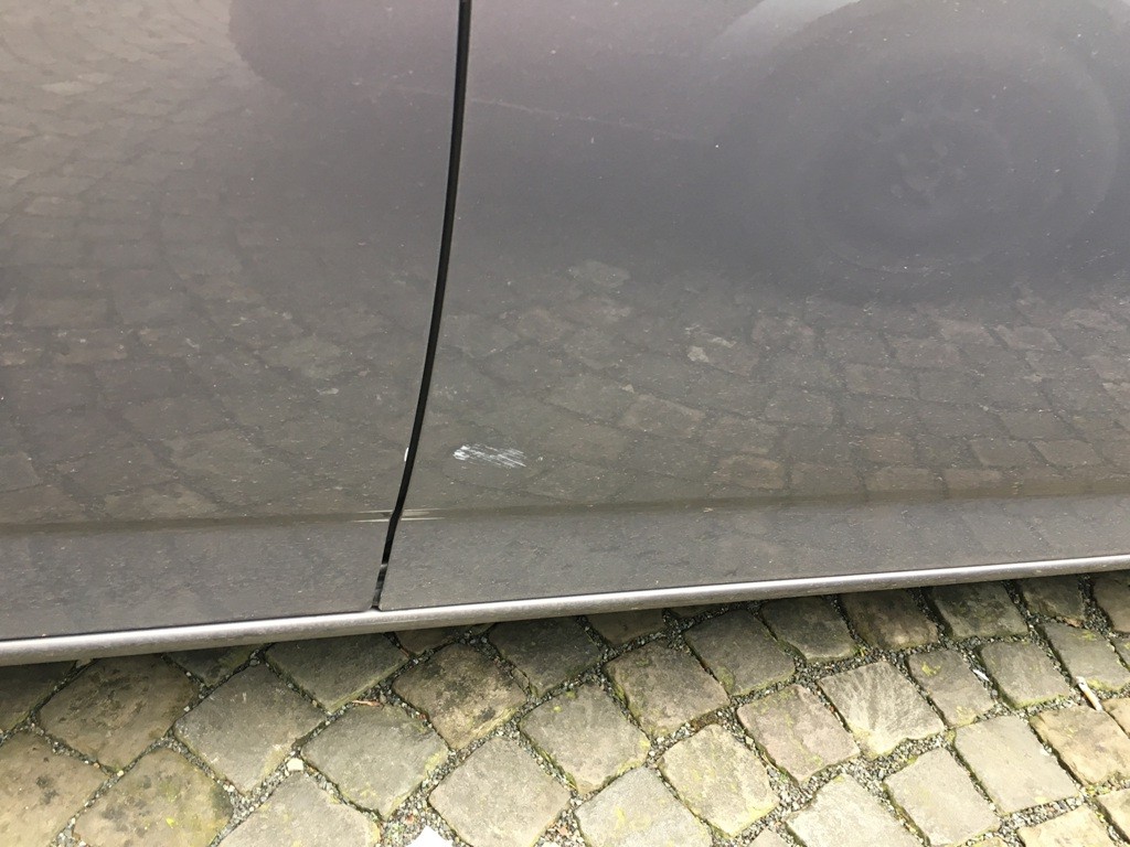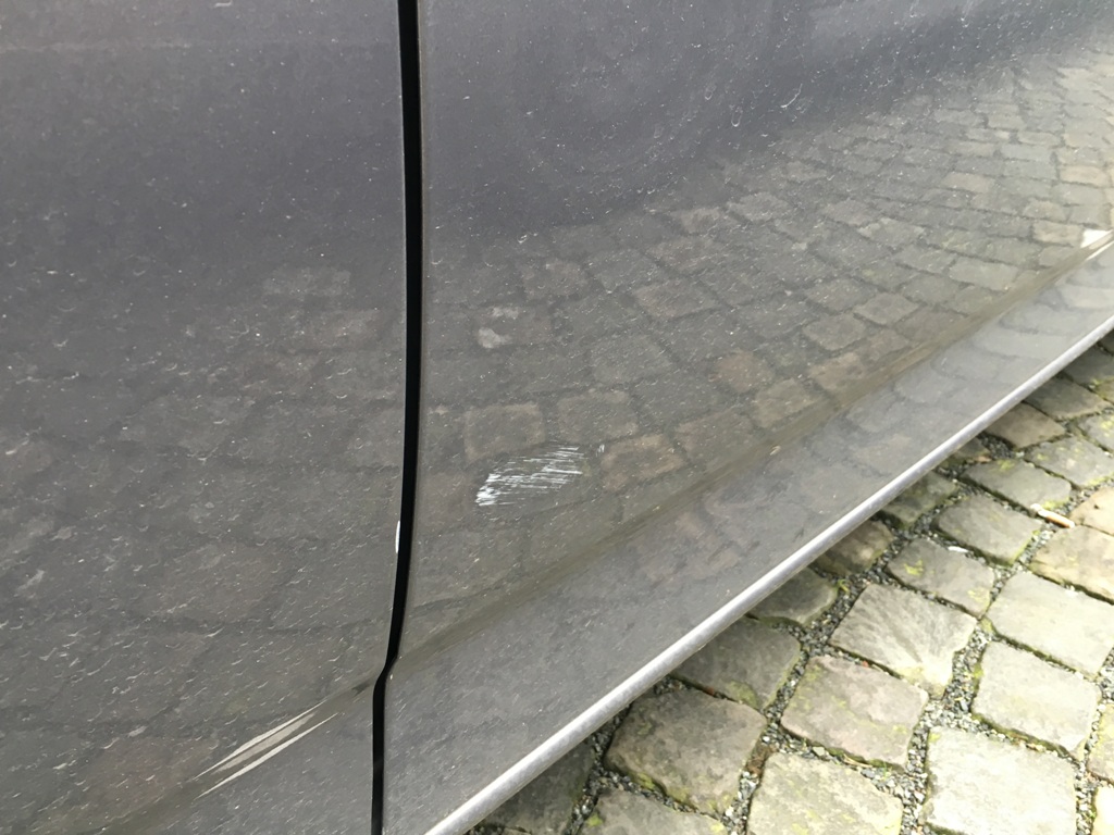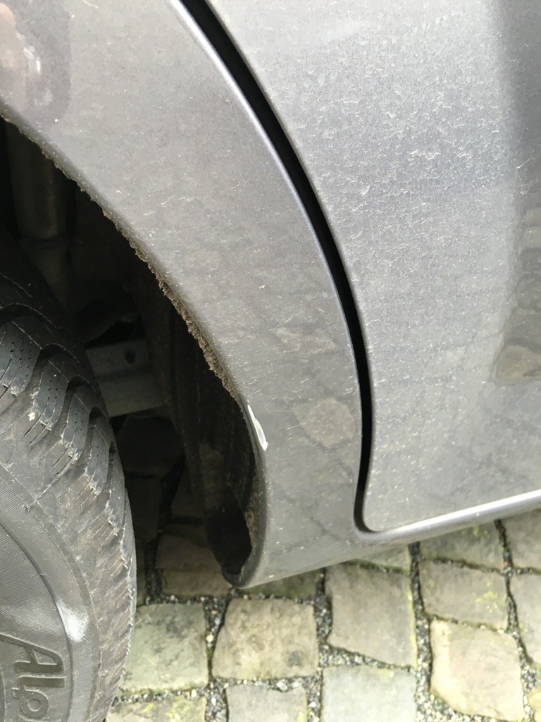 Der Mondeo parkte auf dem Parkplatz in der Firma als ein LKW Fahrer mit seinem 7,5 Tonner gegen eine große Betonkugel gefahren ist und die aufgrund des Gefälles schnur straks gegen meinen armen Mondeo prallte. Getroffen wurde zunächst die Felge hinten rechts, der Kotflügel und dann die Beifahrertür. Sieht alles erst mal nicht so wild aus. Die Polizei rief mich an weil der LKW Fahrer zum Glück nicht einfach weggefahren ist. Wir haben dann Daten ausgetauscht.