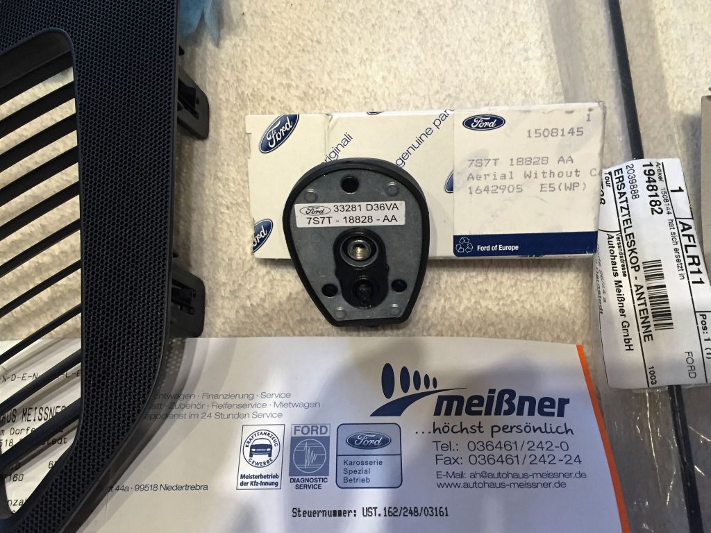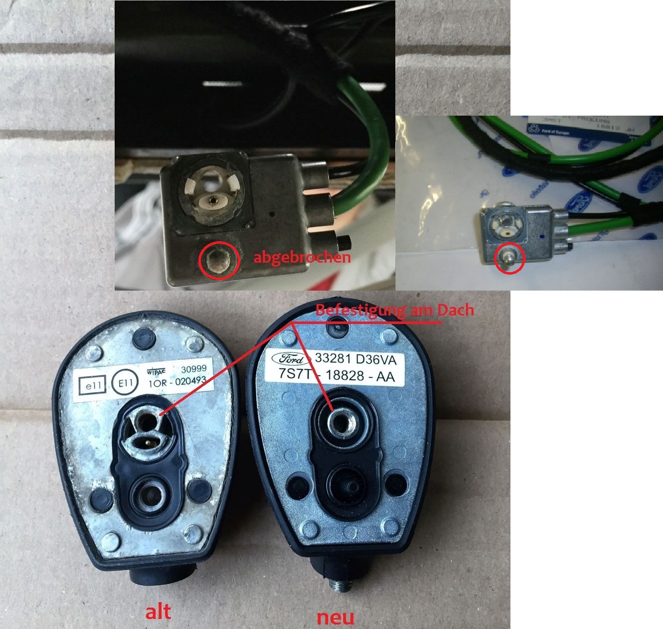 Nun bin ich auf der Suche nach einem Stecker, welcher in den neuen Antennenfuß passt. Der rechte Antennenfuß ist neu, da dieser getauscht werden sollte.