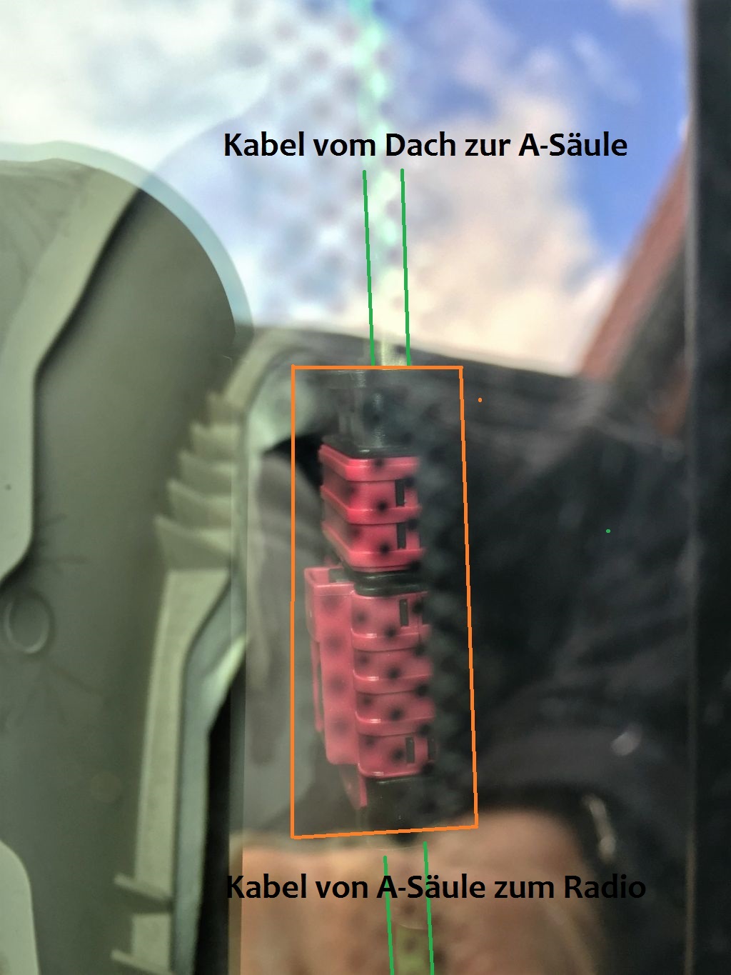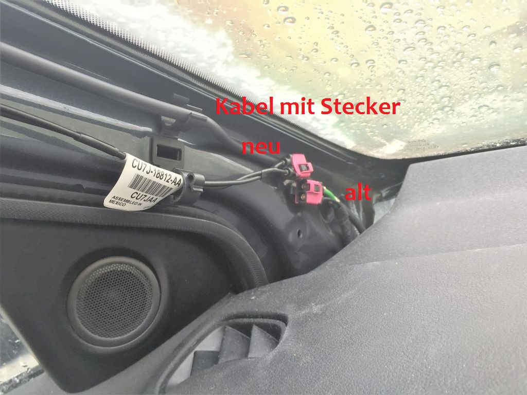 Der neue Stecker (Kabel von der Antenne zur A-Säule) war früher am unteren Kabel (von A-Säule zum Radio)