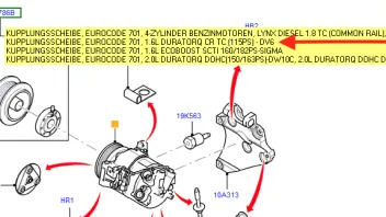 Schau mal ob du das Teil 19D786A vorne links unten im Motorraum siehst . Wenn ja dreht sich das bei eingeschalteter Klima mit oder nicht.