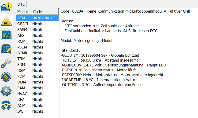 - Fehler gelöscht --> Zündung an --> Motor laufen lassen --> Motor aus --> Zündung an --> Neu ausgelesen --> Fehler U0284 wieder da.
