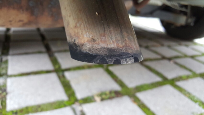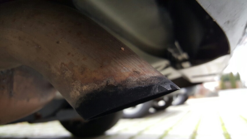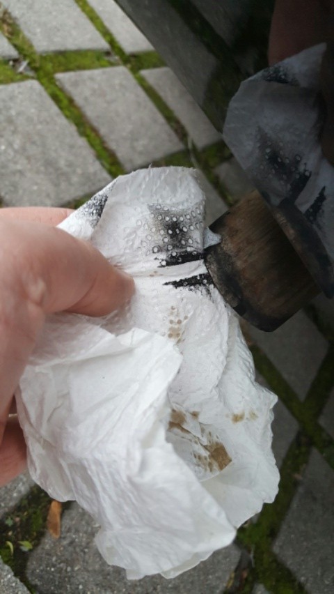 2 Wochen später also heute laufen wir zum Auto und mir fällt gleich der schwarze verrußte Auspuff auf😮. Der war noch nie schwarz wie von einem Diesel. Hab das versucht mit einem Tuch weg zu machen.