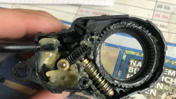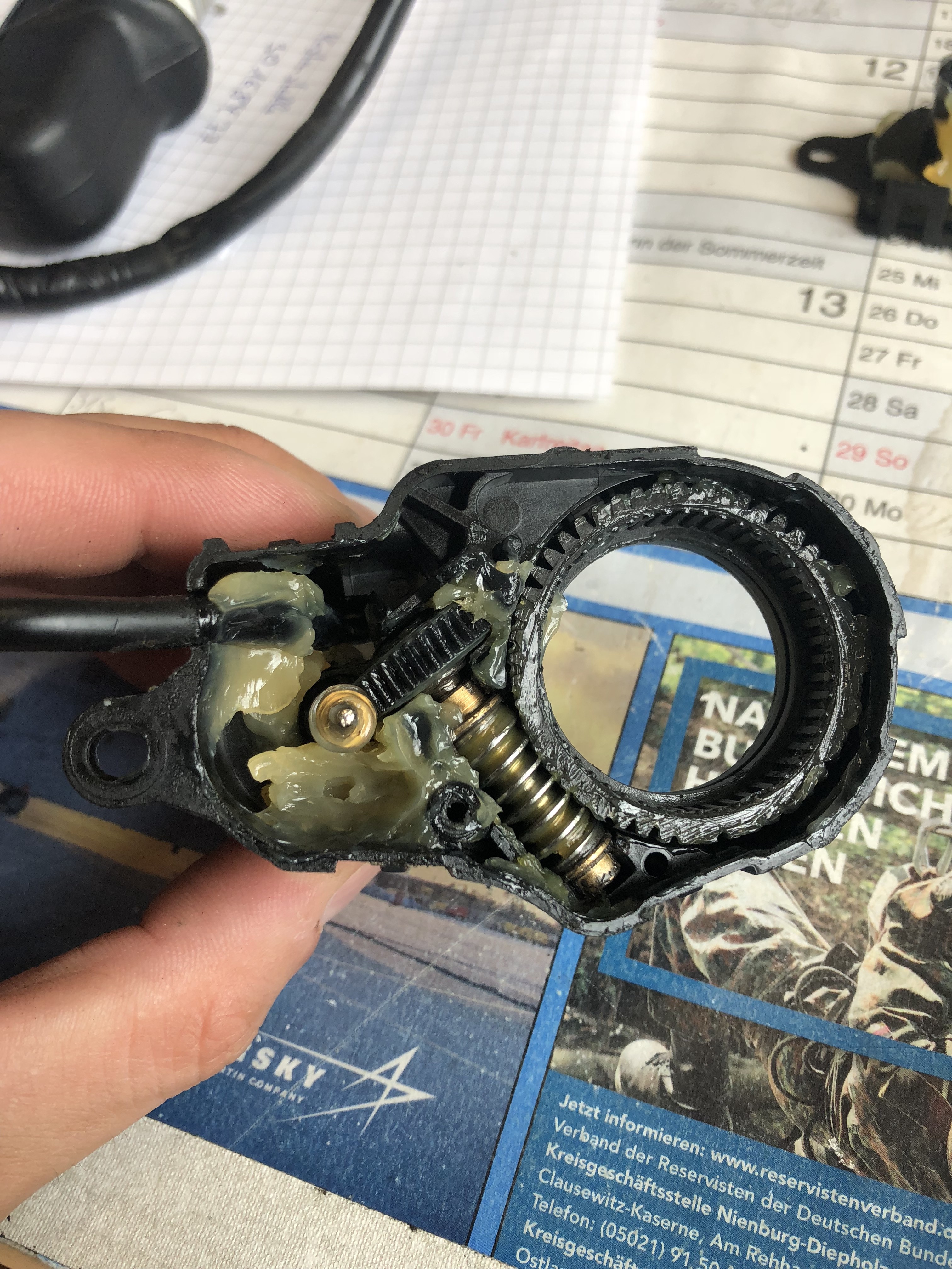 Als nächstes sieht man da zwei Schrauben die das innenleben im Gehäuse festhalten. Die raus, dann außen den Lackierten Deckel abmontieren (auch eine Anleitung von Ford im thread). Dann wird das ganze bisschen beweglich.