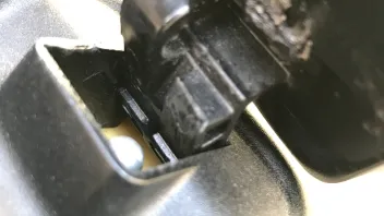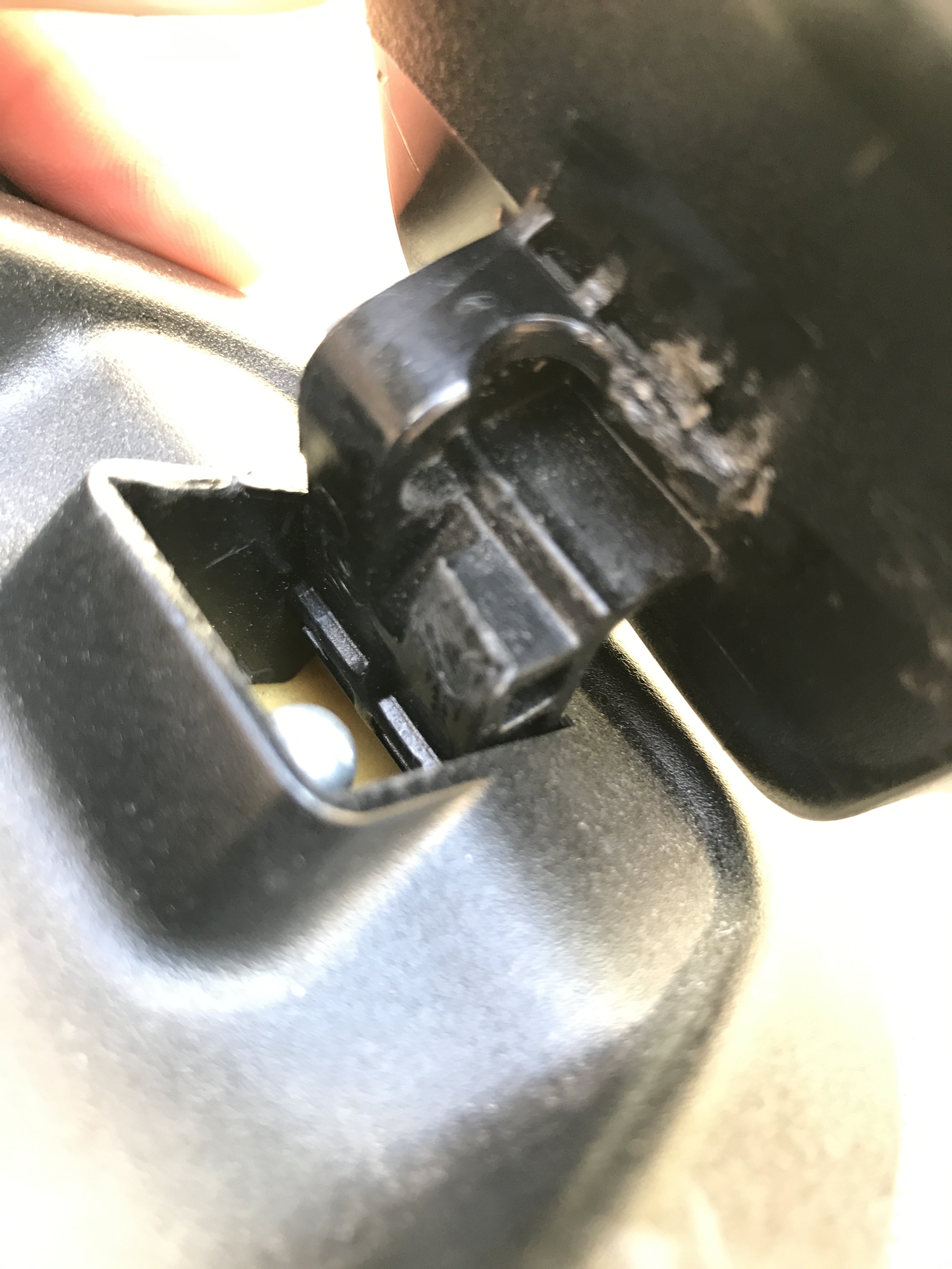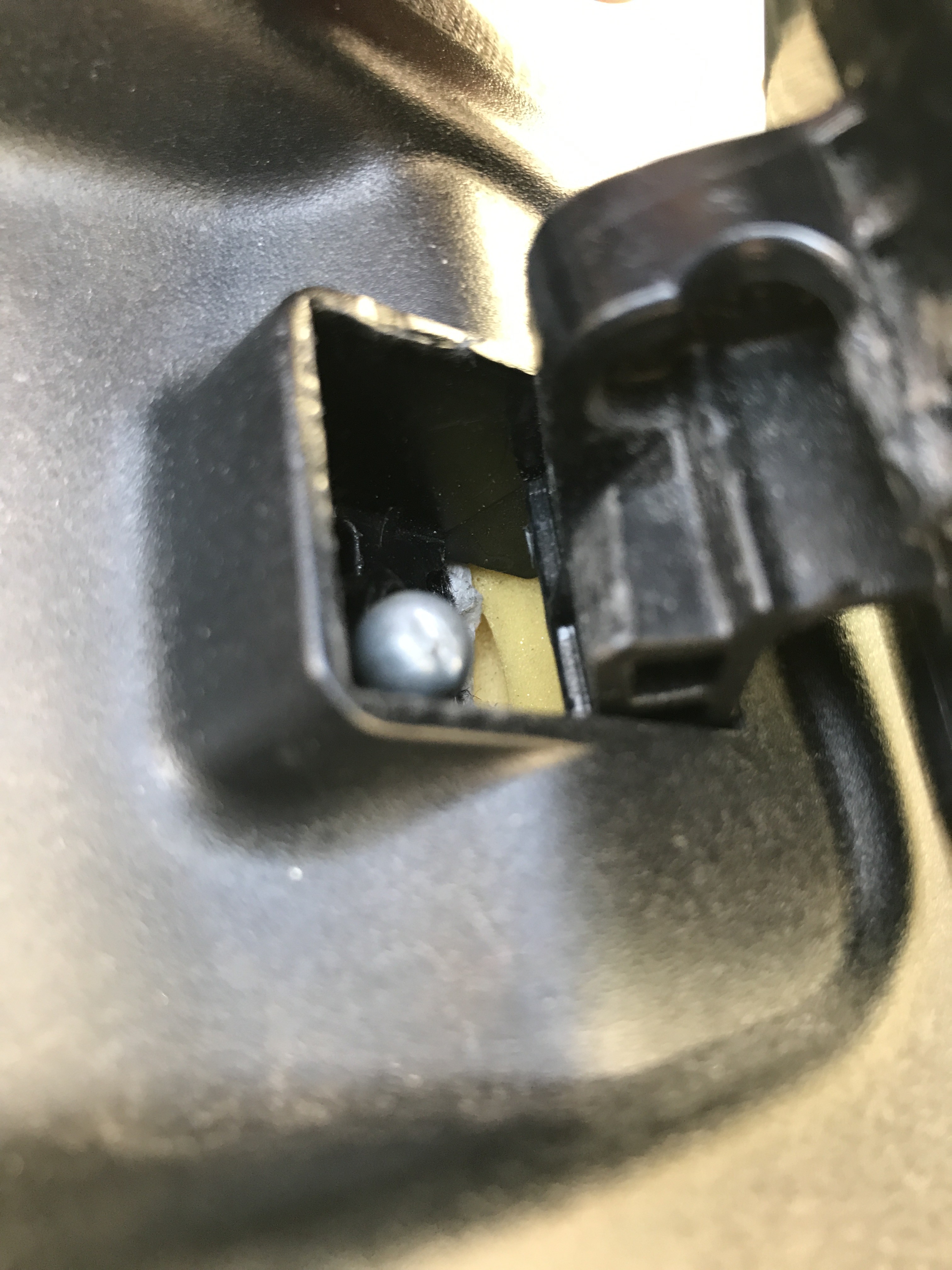 Von den ursprünglich zwei Plastiknasen, die die Kugel vom Seilzug gehalten haben, hat sich die eine verabschiedet und die andere einfach im Stich gelassen.