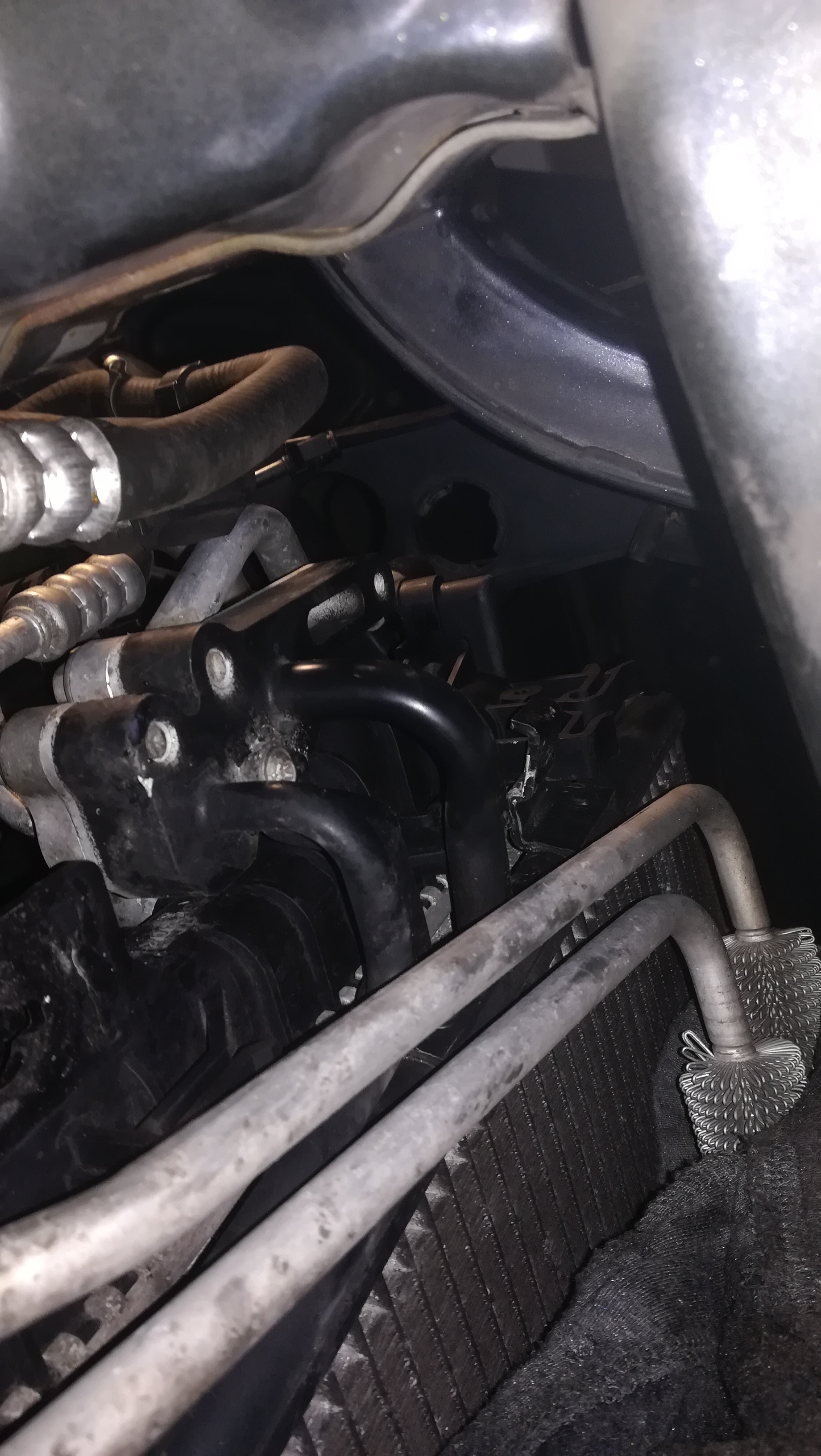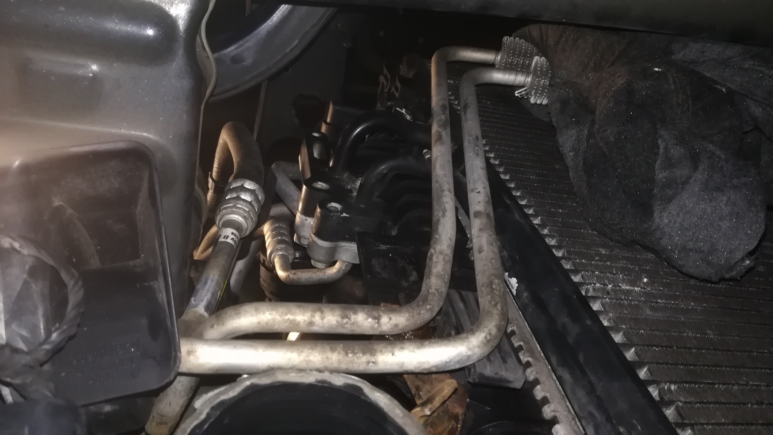 In Fahrtrichtung oben rechts, dort wo der Wasserschlauch angeschlossen wird ist das so verkeilt, dass man den Wasserkühler nicht an den Klimaleitungen vorbei bekommt, keine Chance.