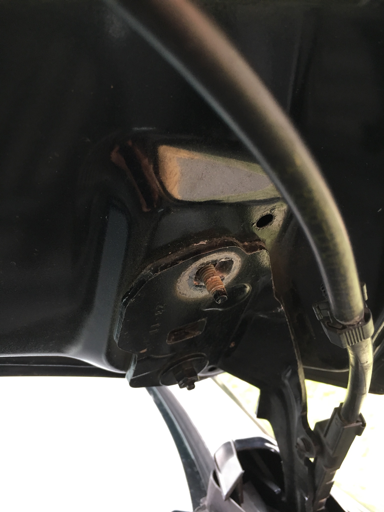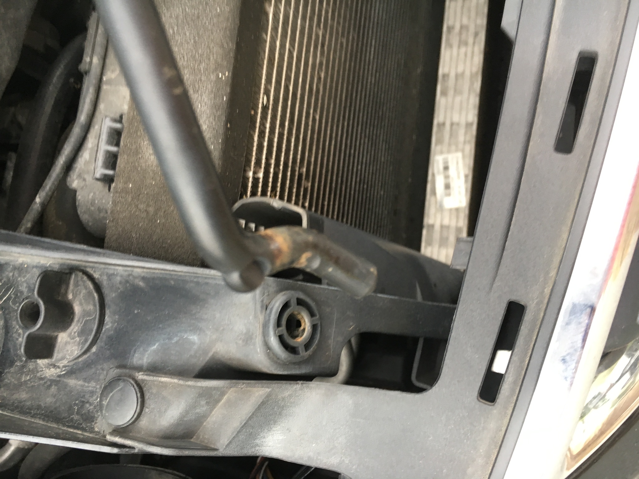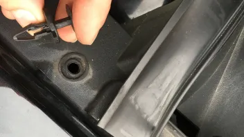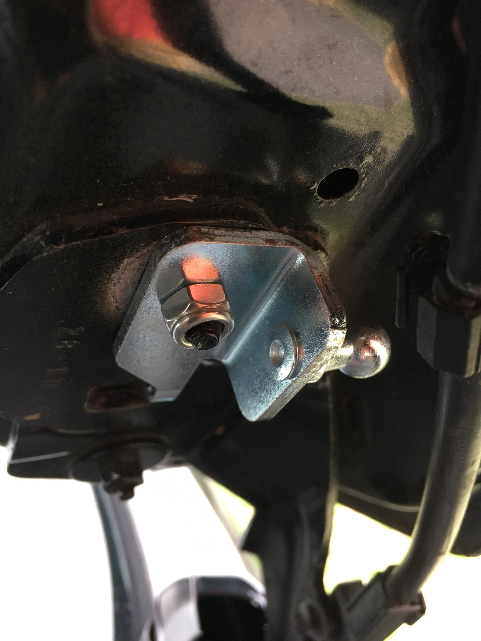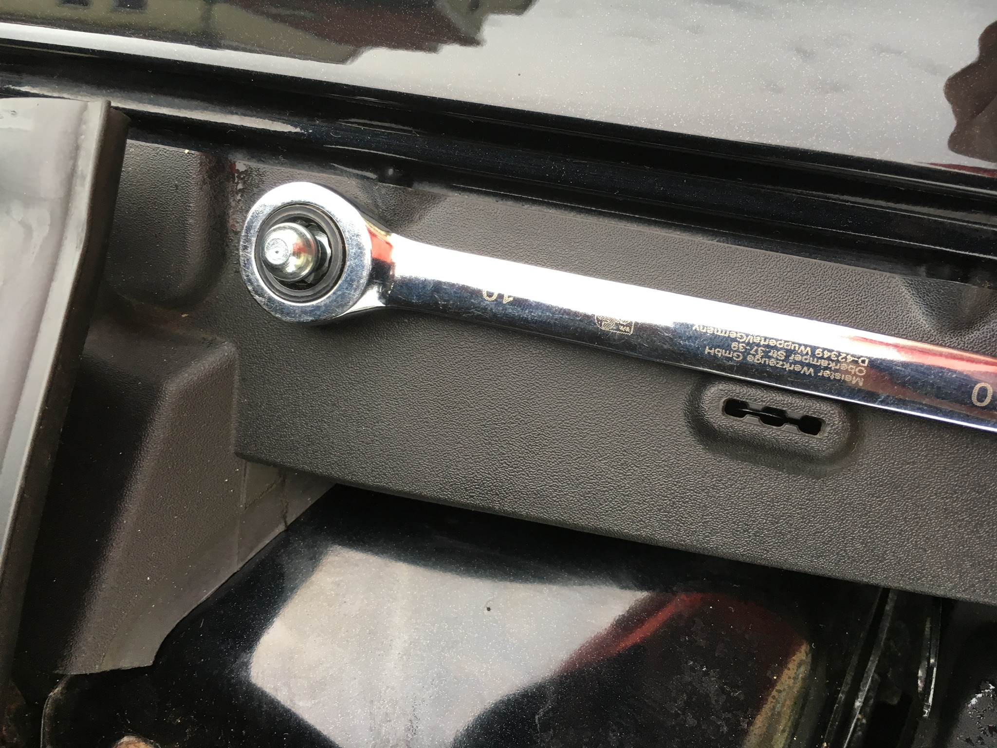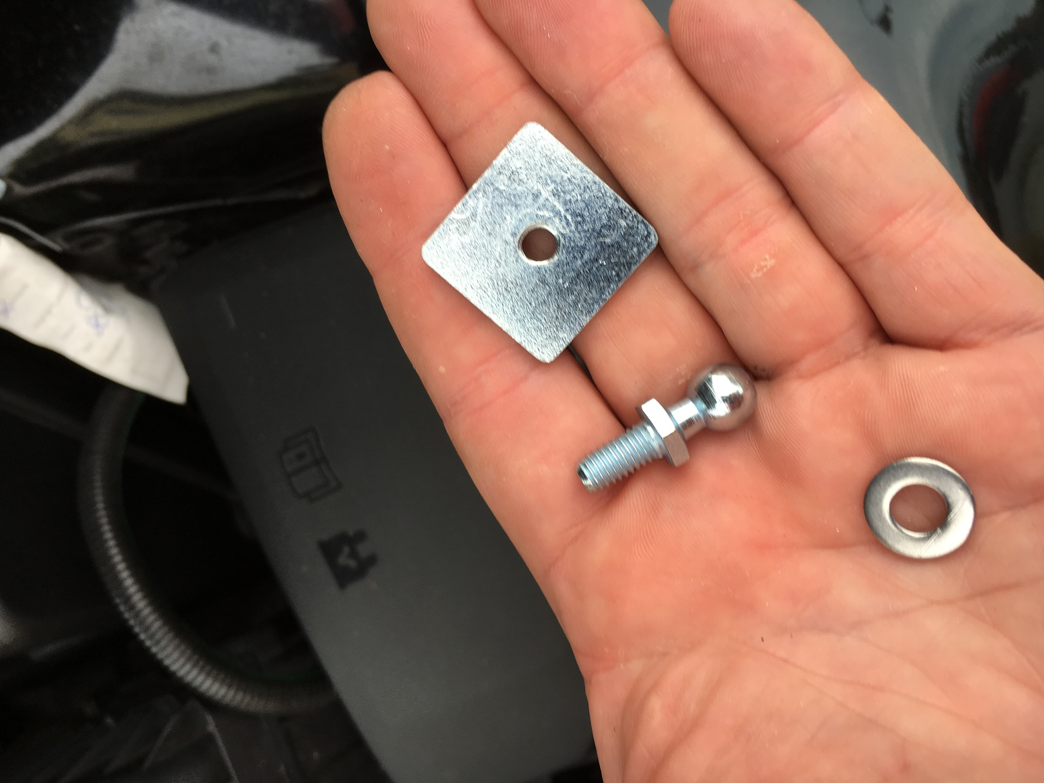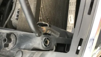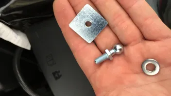 obere Schraube am Scharnier lösen mit 10 er Nuß und entfernen. Halter aufsetzen mit der Nase in die Aussparung des Scharniers und mit selbstsichernder Schraube besfestigen. Unterer Kugelkopf wird befestigt indem man den Dübel entfernt der die Abdeckung festhält auf der Falz des Kotflügels. Gewindeplätchen unter die Falz und durch die Abdeckung den Kugelkopf mit Unterlegscheibe befestigen. Ist ein bisschen fummelig. Aufpassen das das Gewindeplätchen nicht im Radlauf verschwindet.