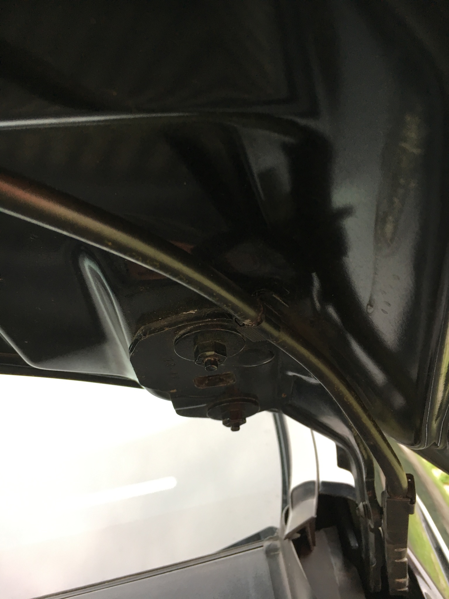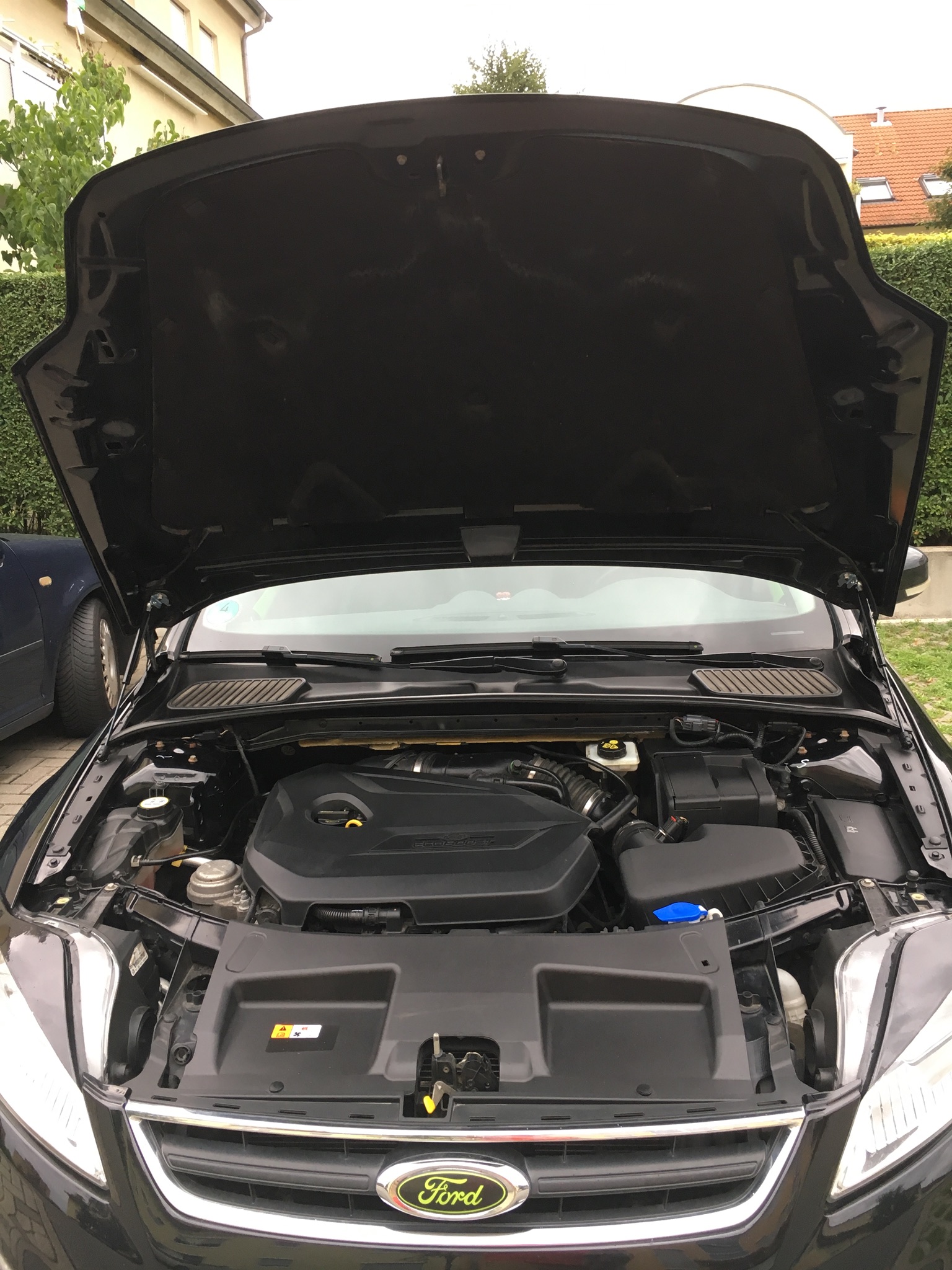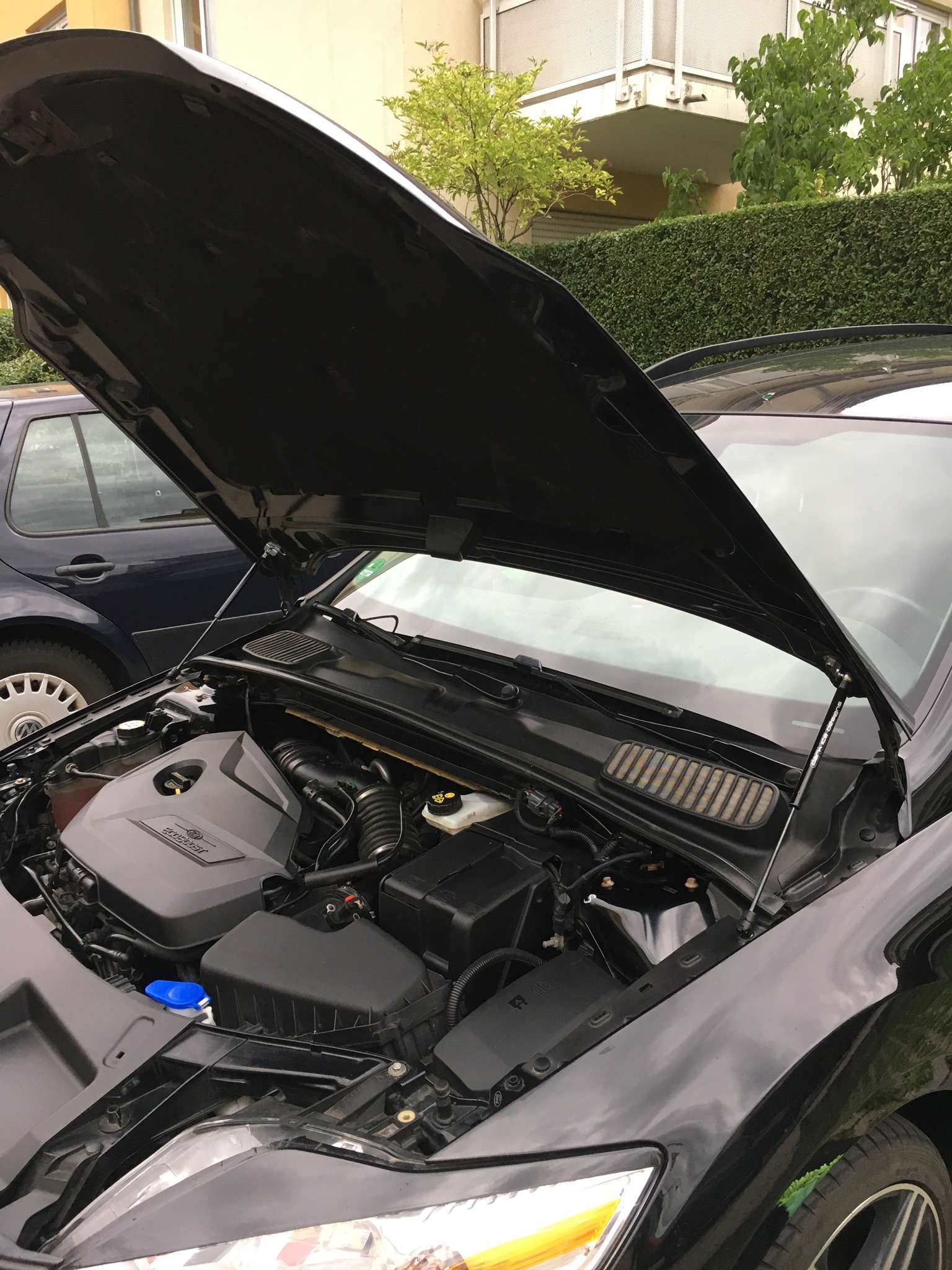 Das ist ja der Vorteil bei der Ausführung. Die Kräfte der Gasfredern wirken auf die Scharniere, die sind recht stabil. Die Gasfedern sind auch recht gut abgestimmt, man braucht nur wenig Druck zum schließen der Haube. Die Haubenstütze hab ich drinnen gelassen. Die stört nicht und die Dämpfer lassen manchmal ganz plötzlich nach.