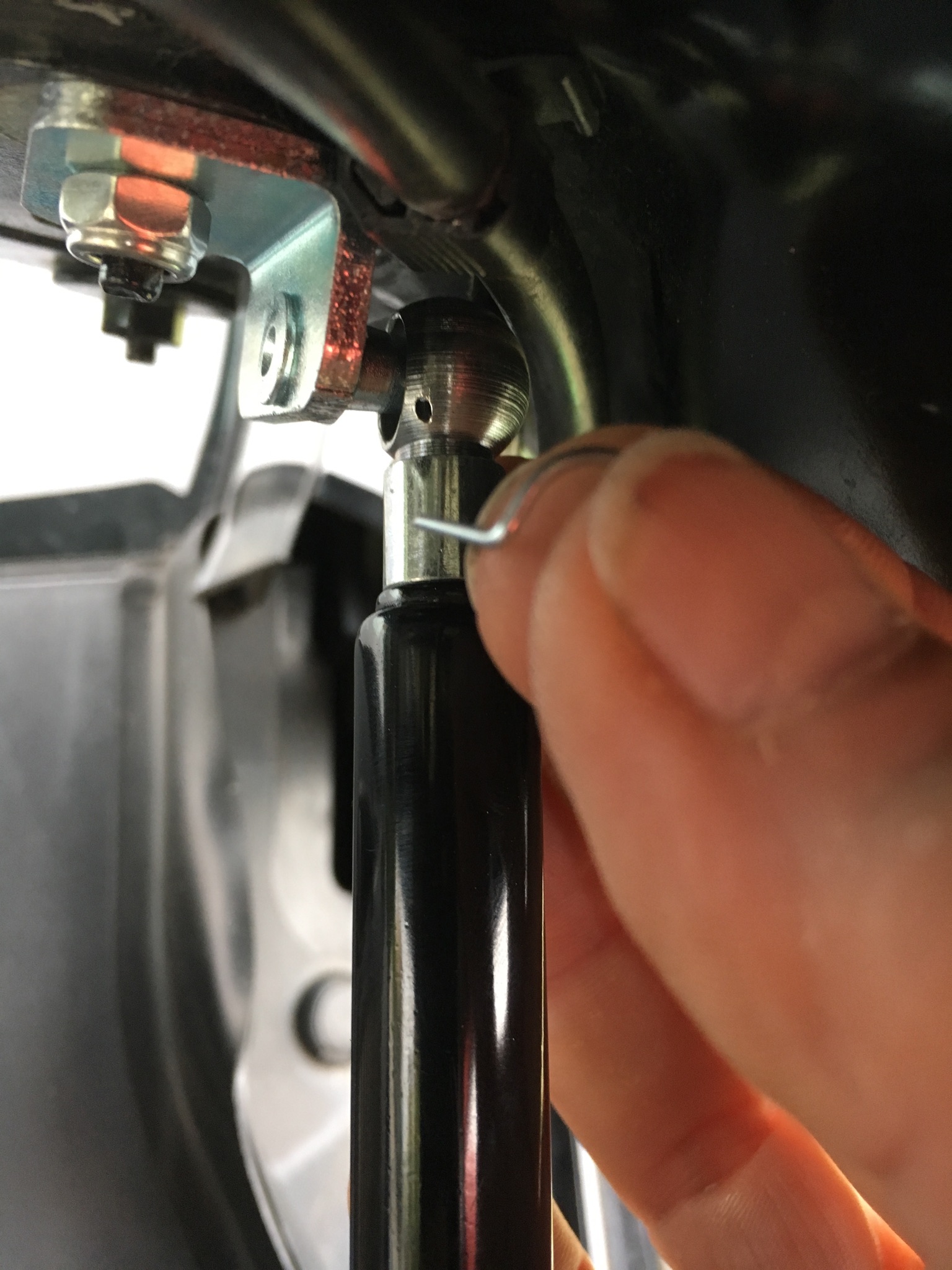 Jetzt noch Dämpfer an der Haube einhängen, mit dem Sicherungssplint sichern. Dann Haube sehr weit nach hinten öffnen und die Dämpfer in die untere Kugel einhängen. Langsam schließen und schauen ob alles richtig montiert ist und nix schleift. Im Anschluss noch Bilder gemacht und man sieht das die Klappe bis zum Anschlag öffnet. Bin Mega zufrieden