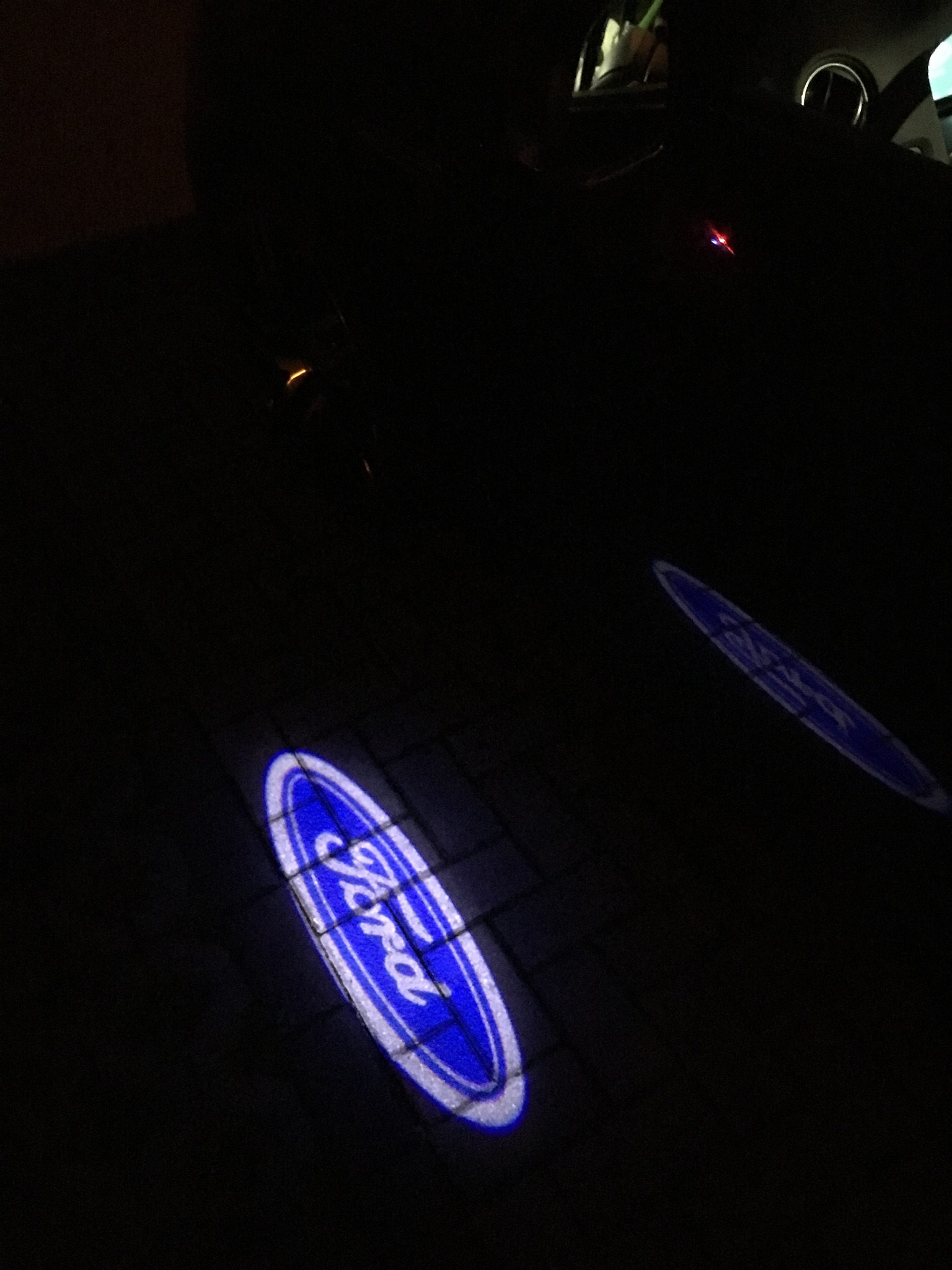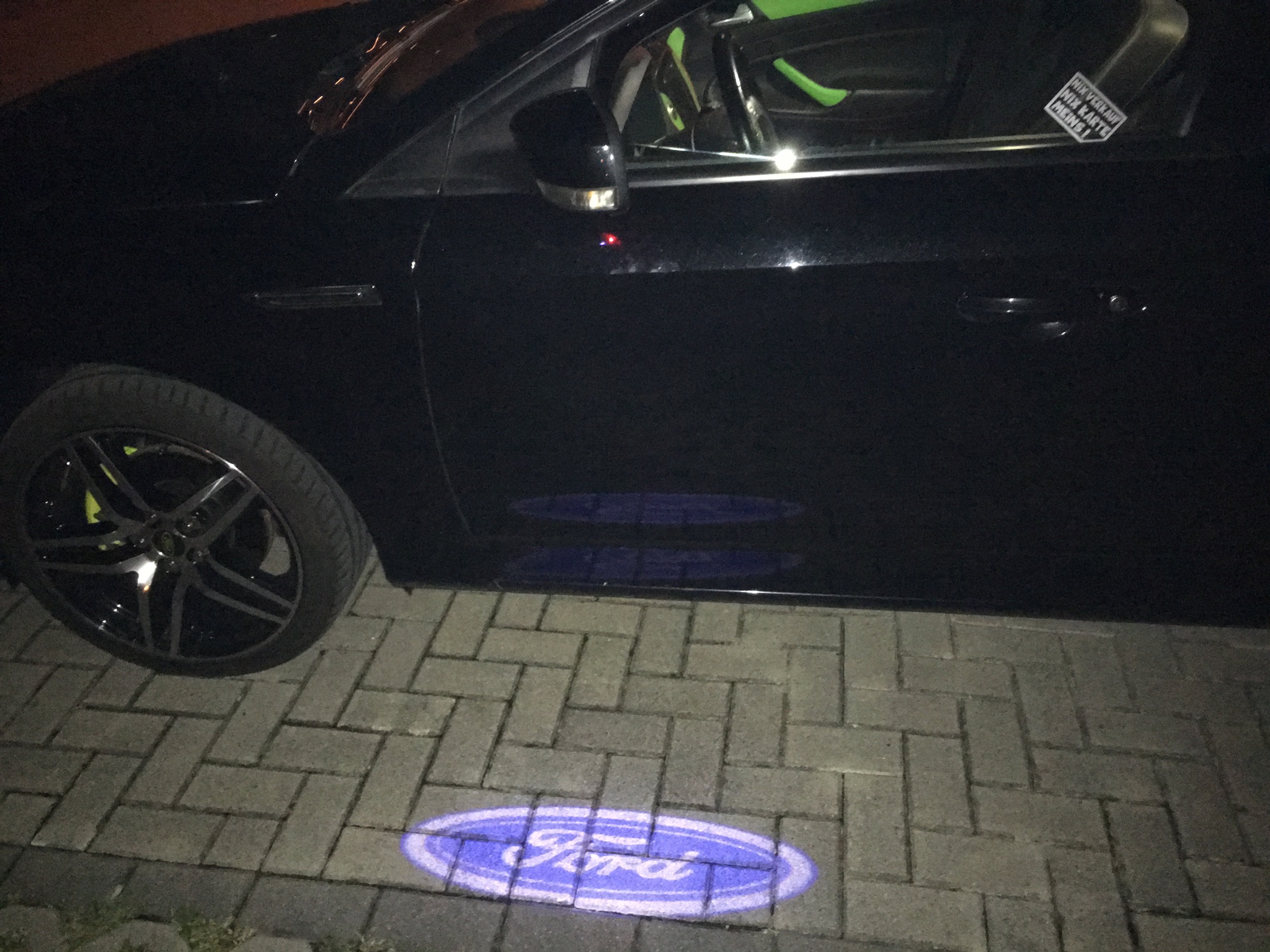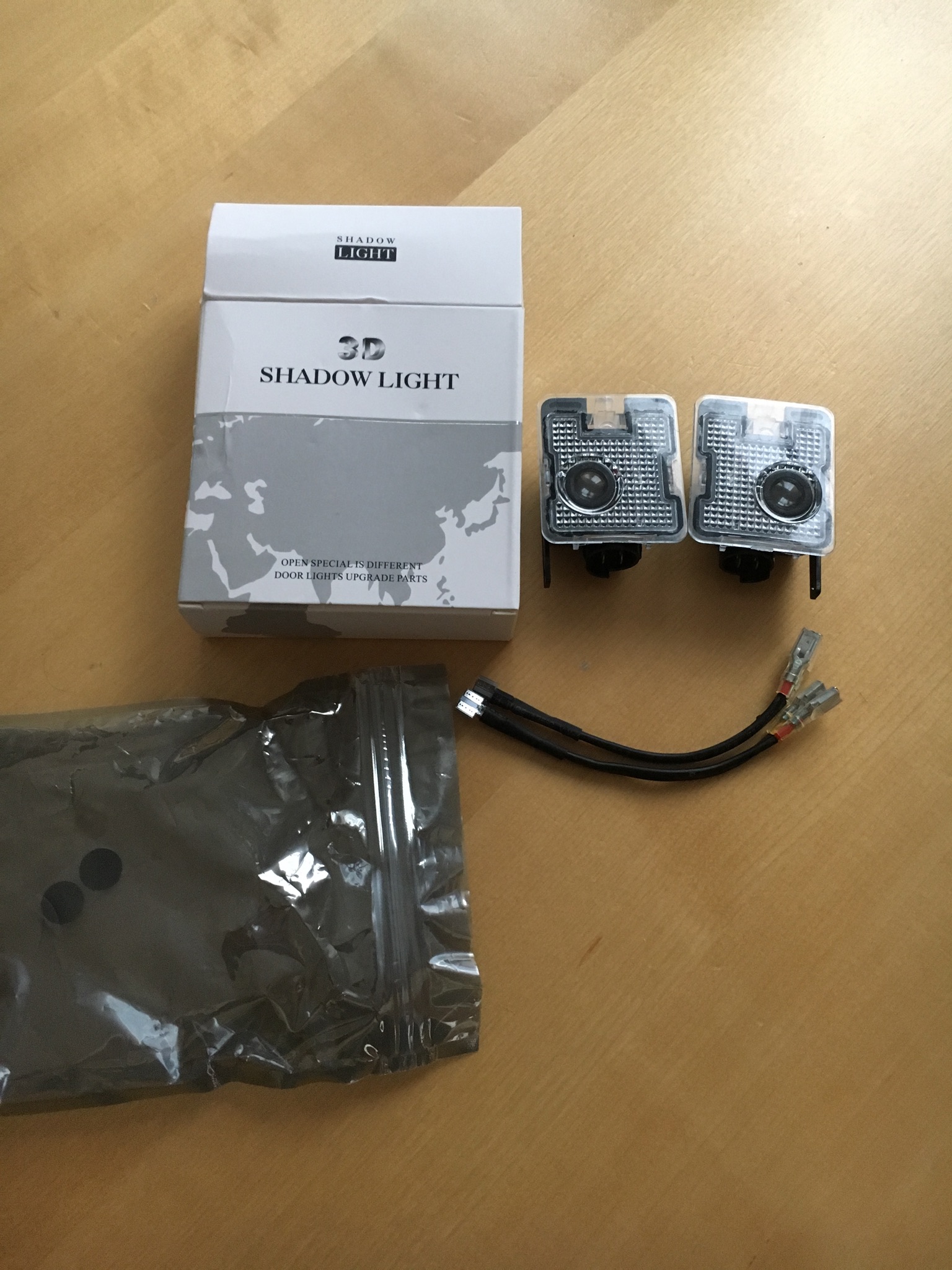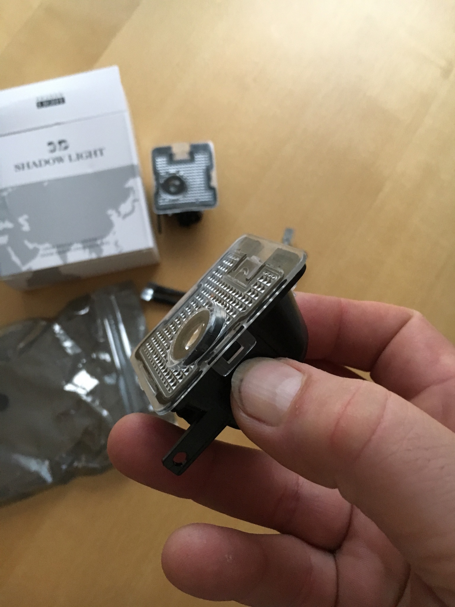 Da ja das in den Türen nicht klappt, wegen Zuviel Stromverbrauch, weil ich schon die Rückstrahler der Türen beleuchtet habe, kommt jetzt diese Variante zum Einsatz. Denn AliExpreß sei Dank. Die Teile passen 1 zu 1. Ist sogar die Nase dran zum verschrauben im Spiegelgehäuse. Die Adapterkabel habe ich abgeschnitten und direkt an die Kabel gemacht und Schrumpfschlauch drüber. War mir zuviel Kabelkram im Spiegelgehäuse sonst und verursachte Wackelkontakte. Mit der kleinen Kreuzschlitzschraube stellt man die Linse für das Logo ein, wie es auf den Boden scheinen soll, quer oder längs. Haltet es in die Position wo das Licht am Spiegel hinkommt und dreht euch das Logo so wie ihr es wollt. Wenn ihr erst alles verbaut habt, kommt ihr nicht mehr an die Schraube. So jetzt einsetzen. Aufkleber auf den Lichtern beachten. L für Links und R für Rechts