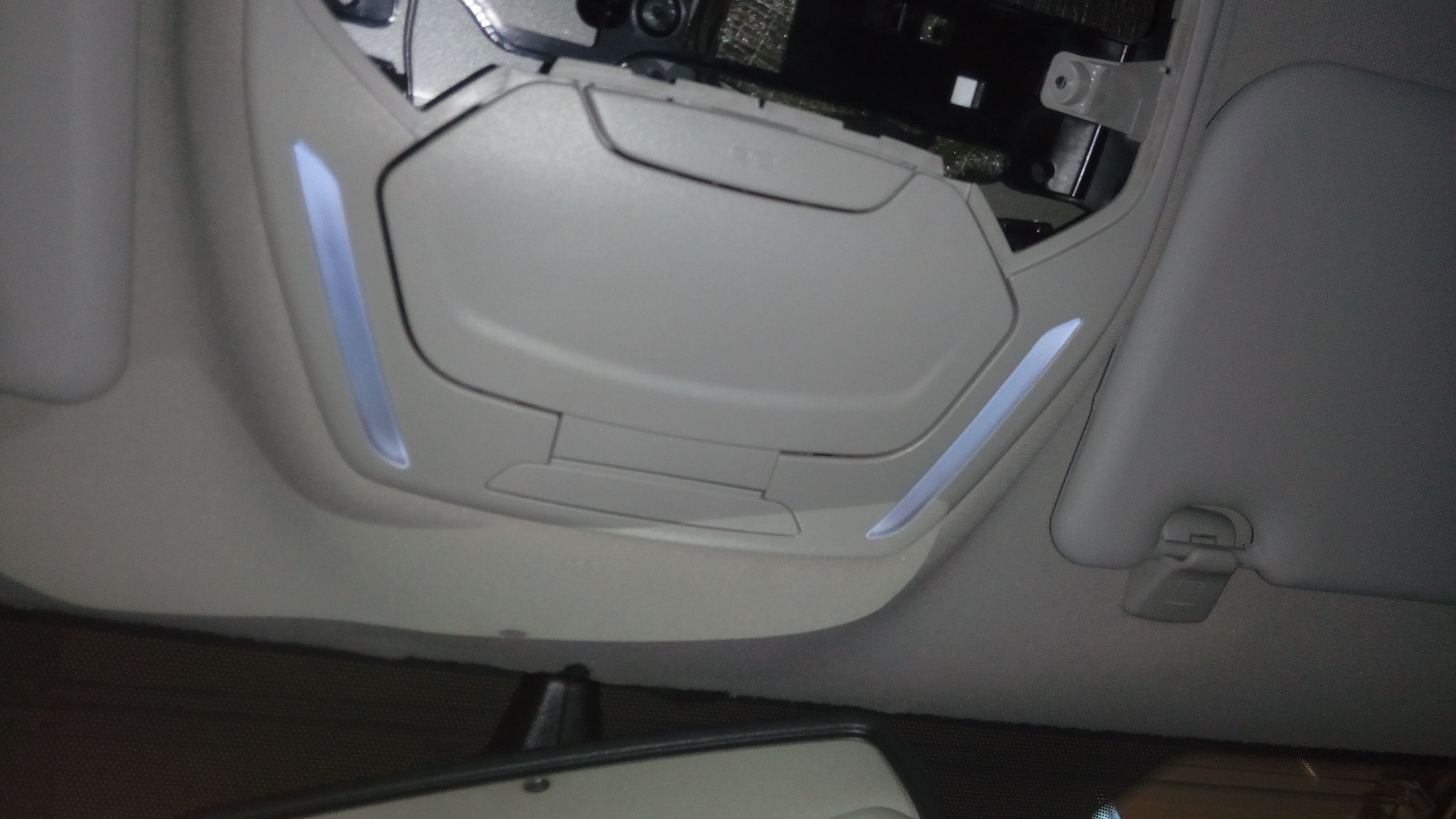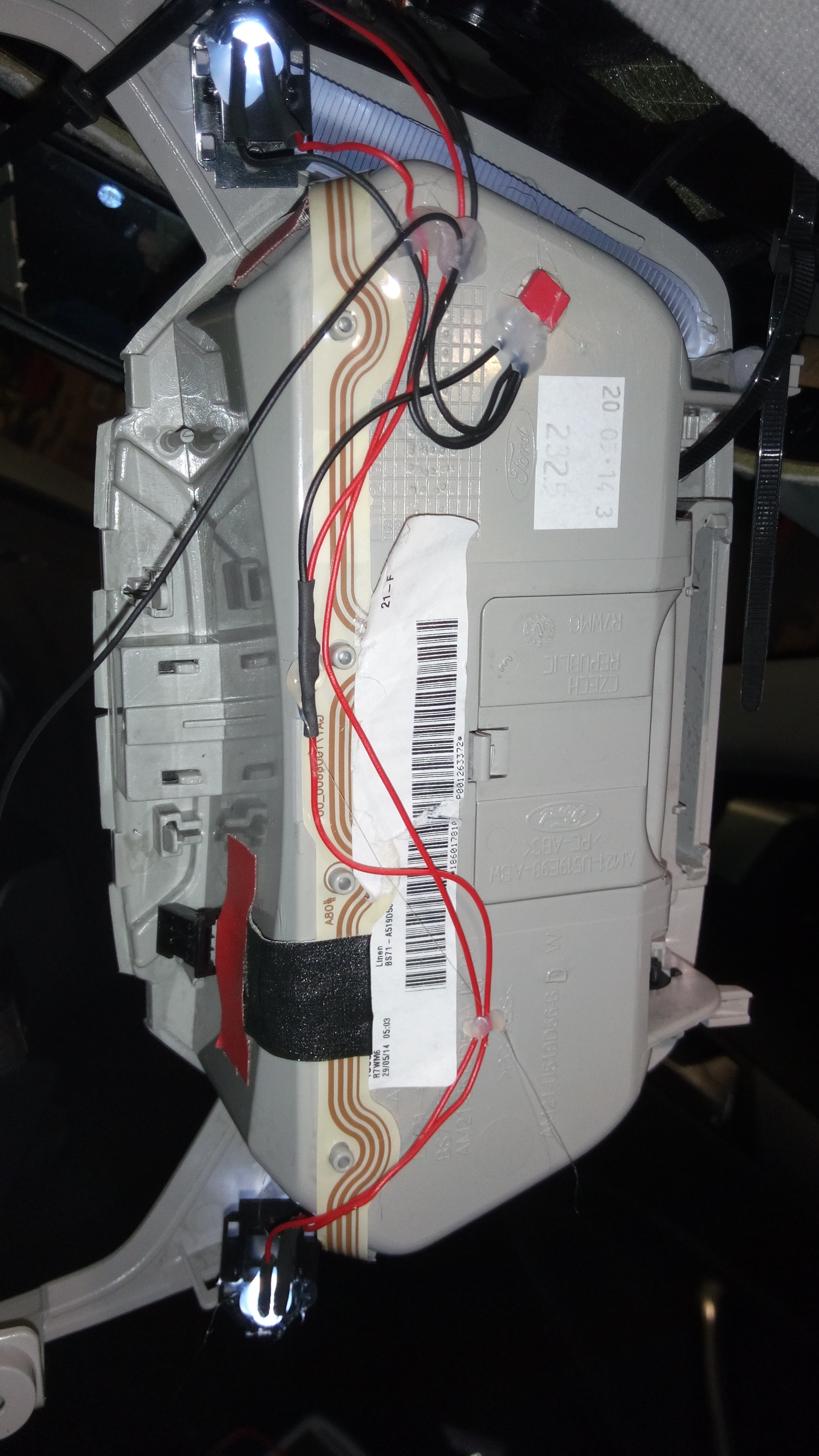 Jetzt wieder in die Garage und erst ein mal den großen Rahmen im Auto eingebaut. Den Strom habe ich von der Leuchte des Schminkspiegels der Fahrerseite abgezapft. Da es nun schon dunkel war gleich ein mal ausprobiert. Mist, viel zu hell, das sah im Keller irgendwie noch anders aus. Also wieder runter und noch ein mal einen 1k Ohm Widerstand geholt und diesen noch ein mal eingelötet. ![]()