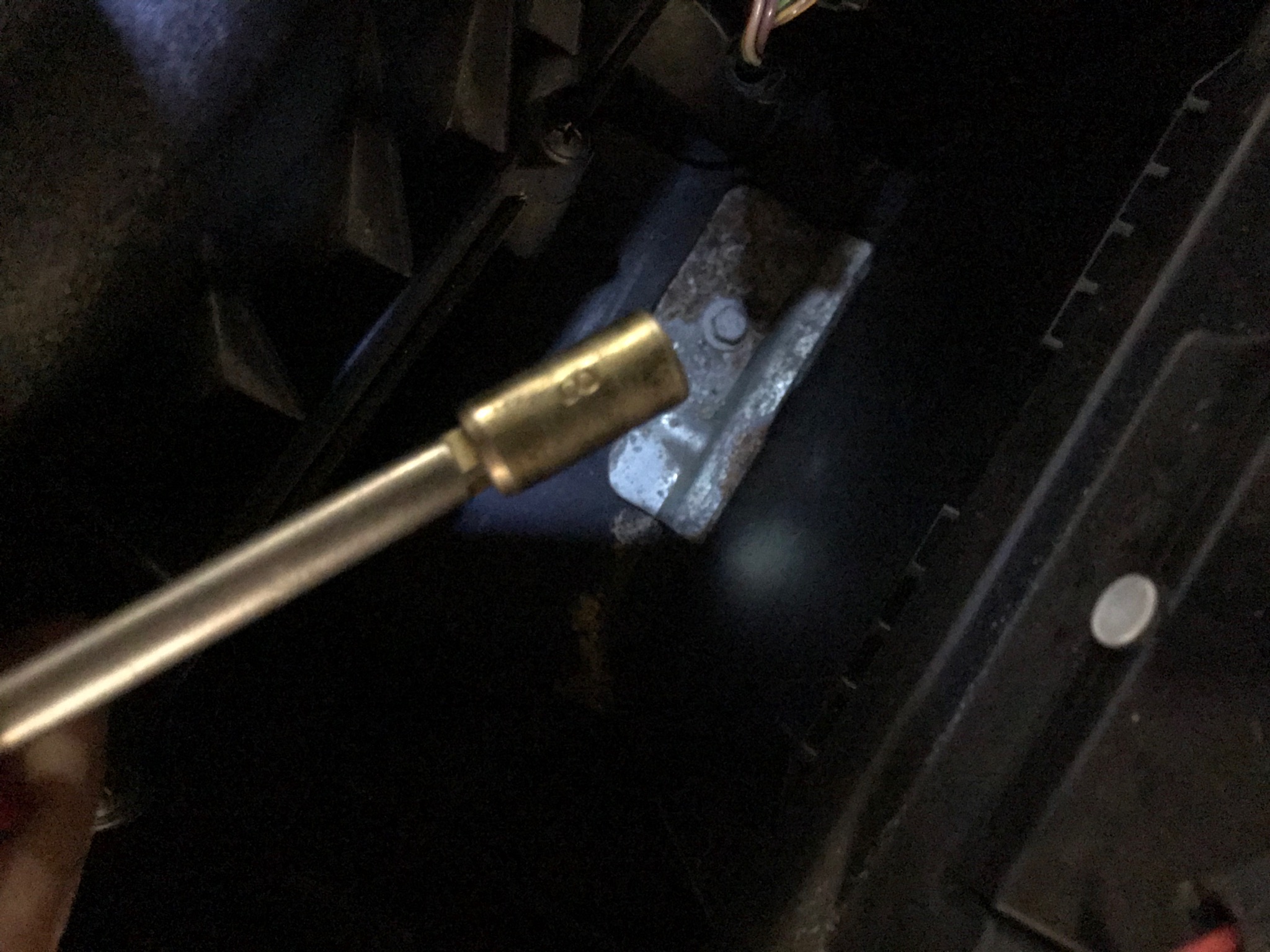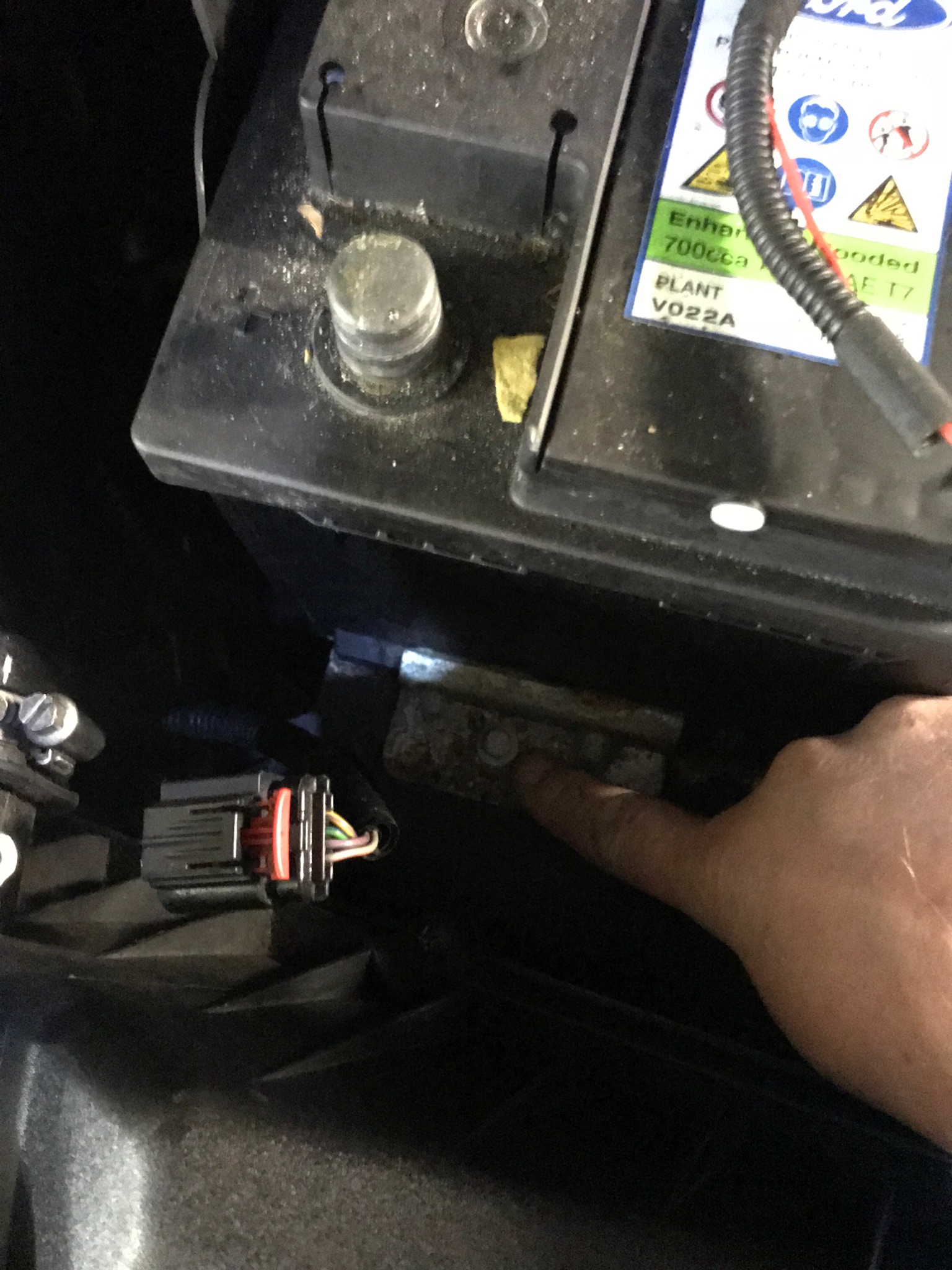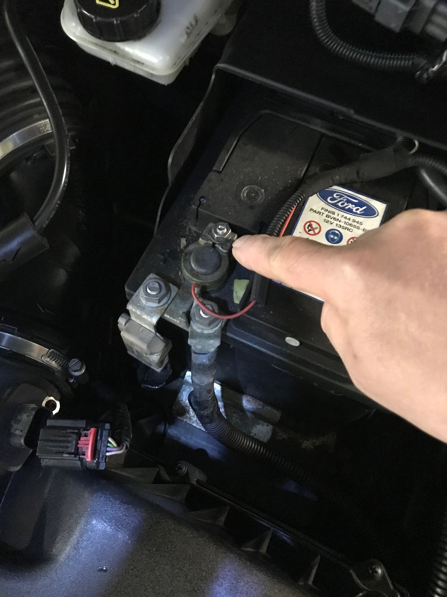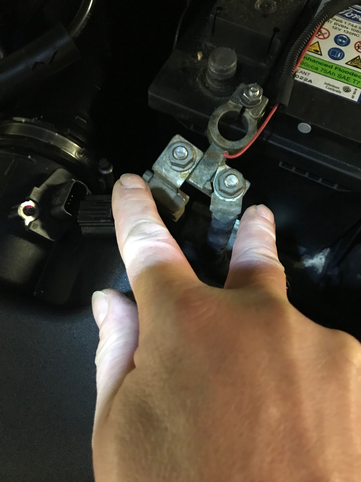 10. Batterie nach vorne herausziehen bis der Minuspol sichtbar ist. Danach mit 10er Nuß entfernen