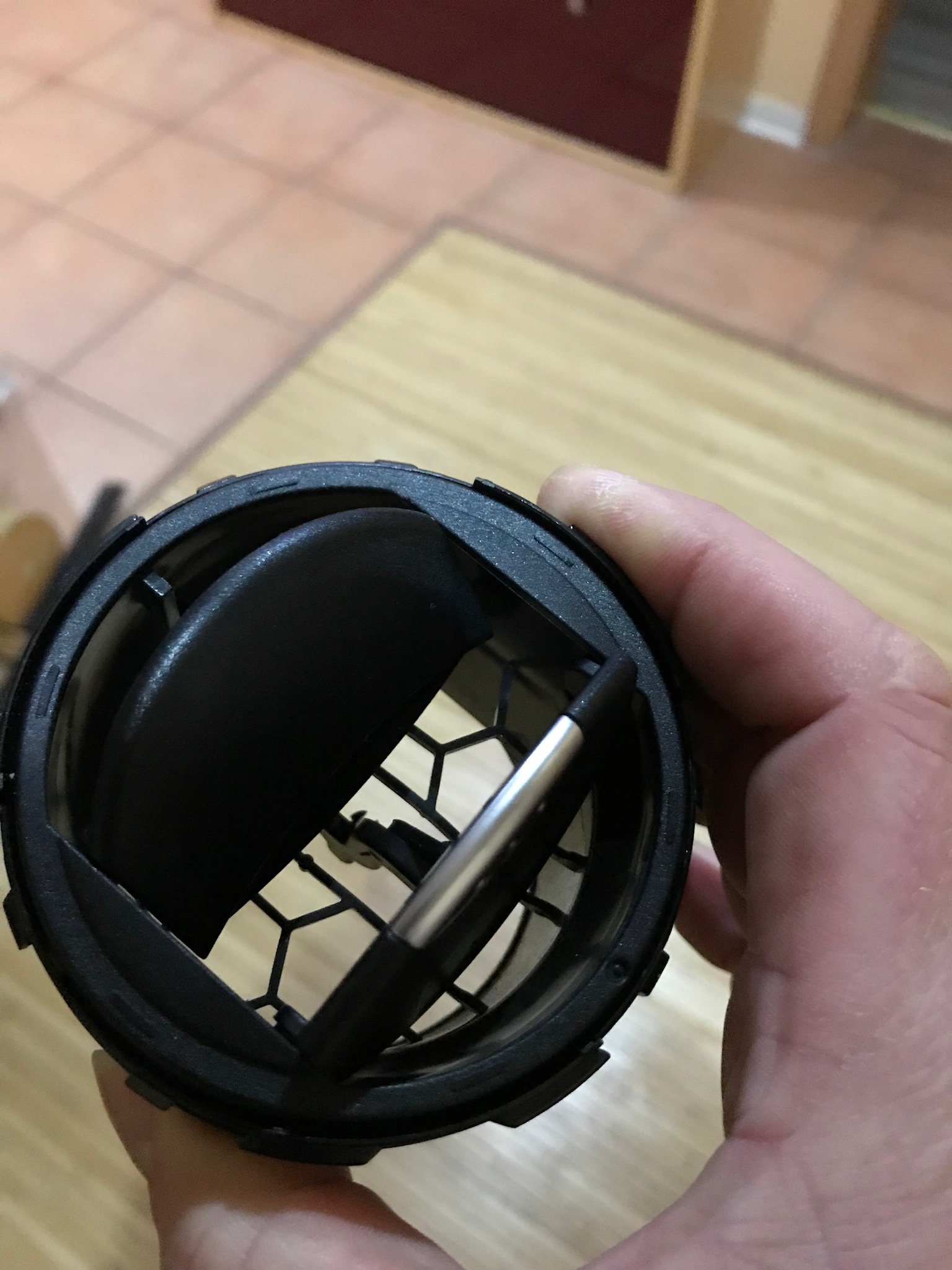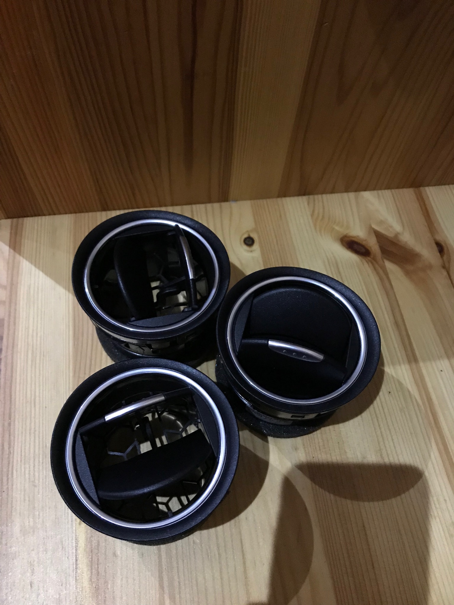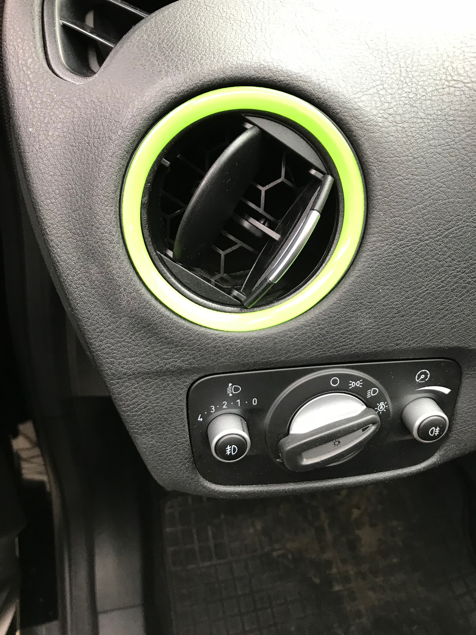 Habe danach Plastikring und Chromring abgeclipst und den Chromring mit Plastidip geschwärzt. Mir ging das gespiegel in der Windschutzscheibe auf den Zeiger. Nun die Silikonringe nach Anleitung aufbringen und fertig. Nach Anleitung heißt: Plastik entfetten, Ringe wenn es geht gleich beim ersten Mal richtig „kleben“. Mit dem Fön schön nochmals erwärmen, andrücken und fertig. Düsen wieder einsetzen. Macht man nix falsch. Ist alles markiert. Auf der Düse ist ein Pfeil und im Armaturenbrett eine Nase. Damit auch der d.. Mechaniker das wieder zusammengebaut bekommt. Äh ja auf dem Bild sind nur drei Düsen, die vierte brauchte Länger um aus dem Armaturenbrett zukommen.