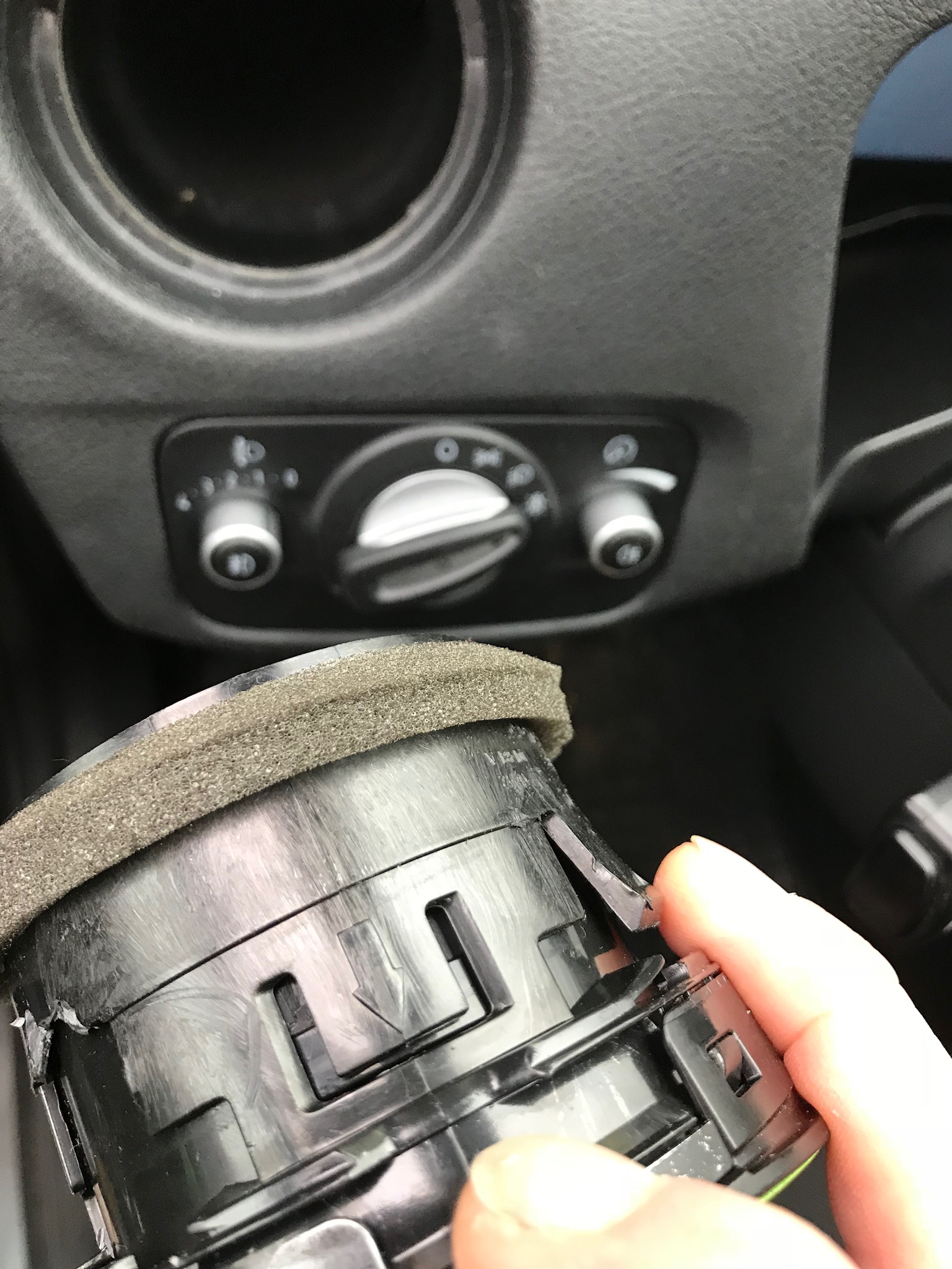 Jetzt sind die Lüftungsdüsen dran. Ausbau geht ein bisschen schwer. Eigentlich sind die Teile komplett gesteckt, aber beim ersten Mal tun die sich schwer. Man muß die Nasen richtig treffen die die Düse festklemmen und dan einfach mit kraftvollen Gefühl raus damit