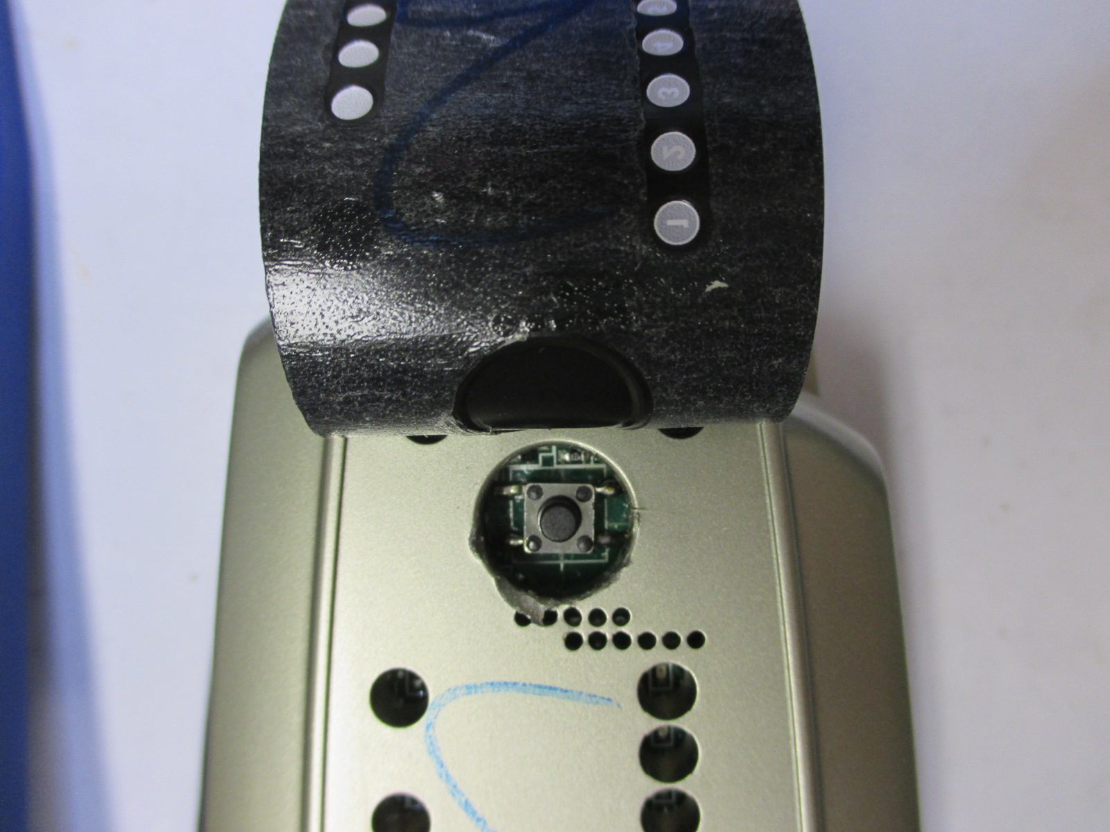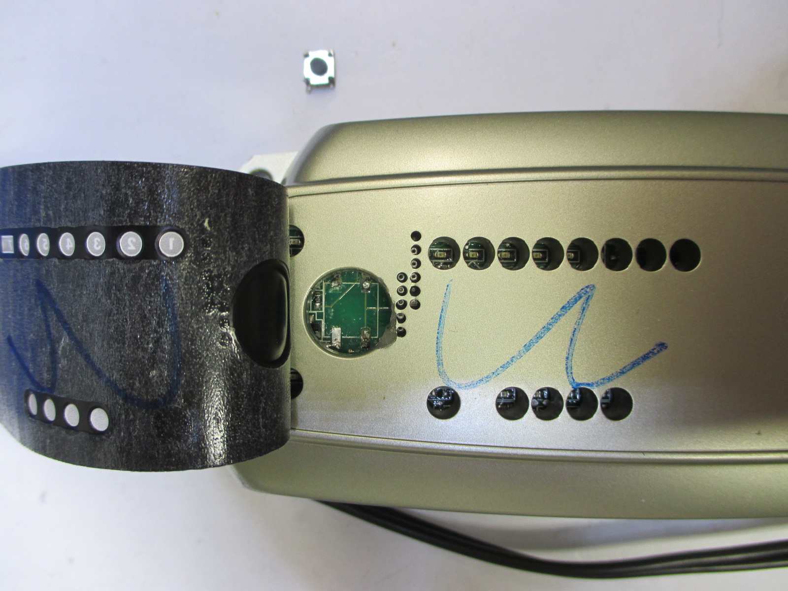 Das fiese beim MXS 5.0 im Vergleich zu den anderen aus dem Mikrocontroller-Forum ist, das hier scheinbar das Gehäuse IP65-Sicher verklebt statt verschraubt wurde. Ich konnte jedenfalls keine Schraube ausmachen, auch nicht unter der Folie. Als ich die aber eh ab hatte (vorher schön warm gemacht damit es keine Falten wirft) konnte ich Zugang zum Taster erlangen. Meßgerät dran, tatsächlich kein Durchgang beim betätigen. Dann entschloß ich mich zu einer Endoskopischen Behandlung, hab den Taster ringsrum abgezwickt, dann die Reste rausgelötet und nen neuen rein (hatte zufällig sowas da und ja, der ist auch anders als bei den anderen MXS Versionen, echter 0815-Taster), feddisch.Schon kann ich wieder ganz normal und einfach umschalten. Prima!