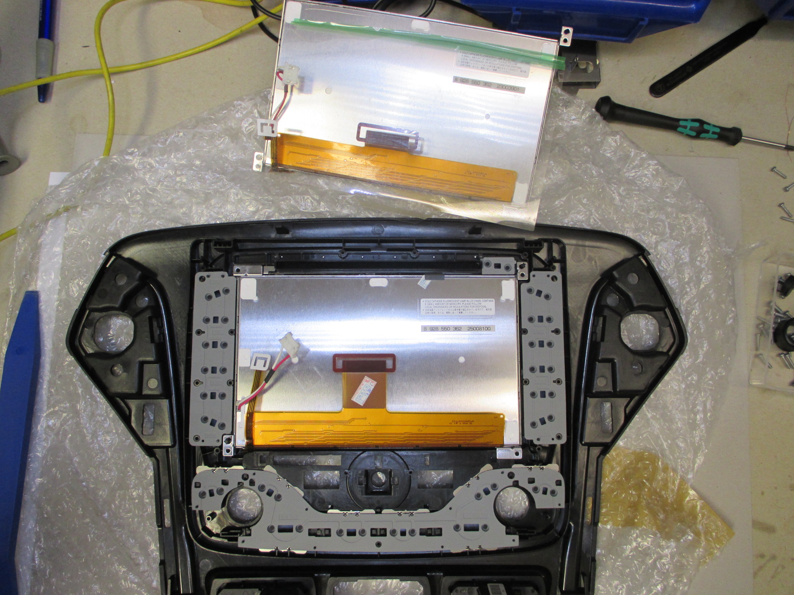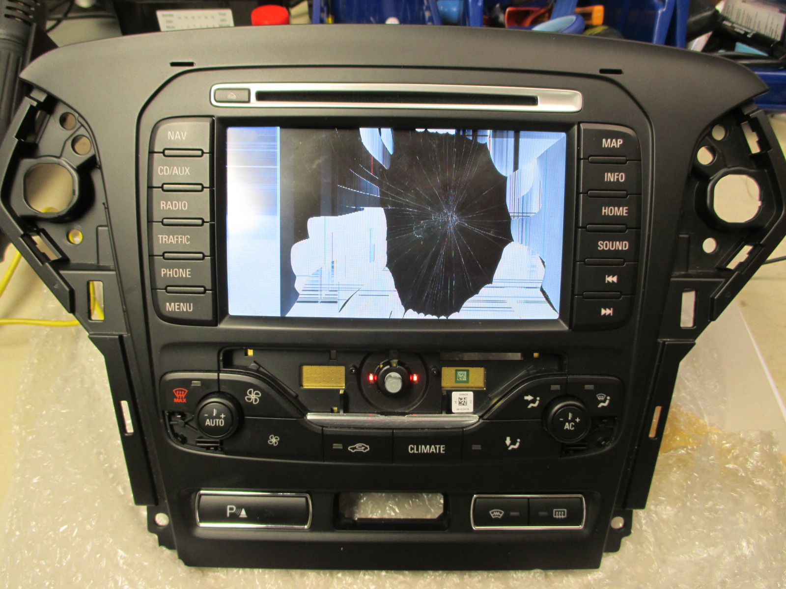 • Heute hab ich das defekte Display von AlfaFoxtrot bekommen. Er konnte es selbst soweit zerlegen das wir nur die Frontplatte verschicken mussten und nicht das ganze Radio. Ich habs dann doch erstmal an mein MCA angeschlossen um mir ein Bild vom Schaden zu machen.