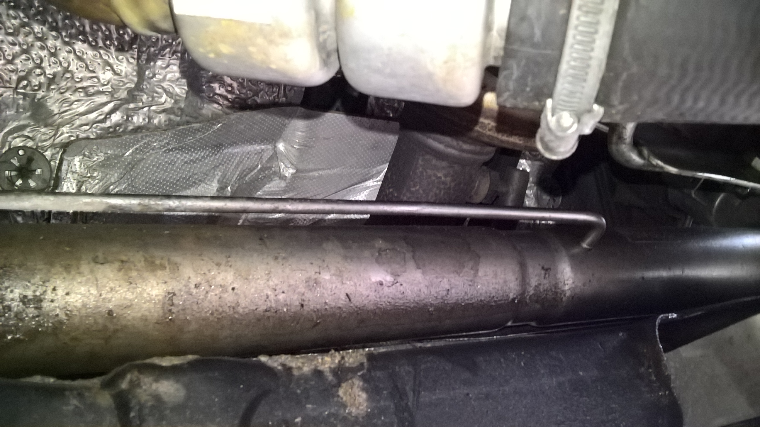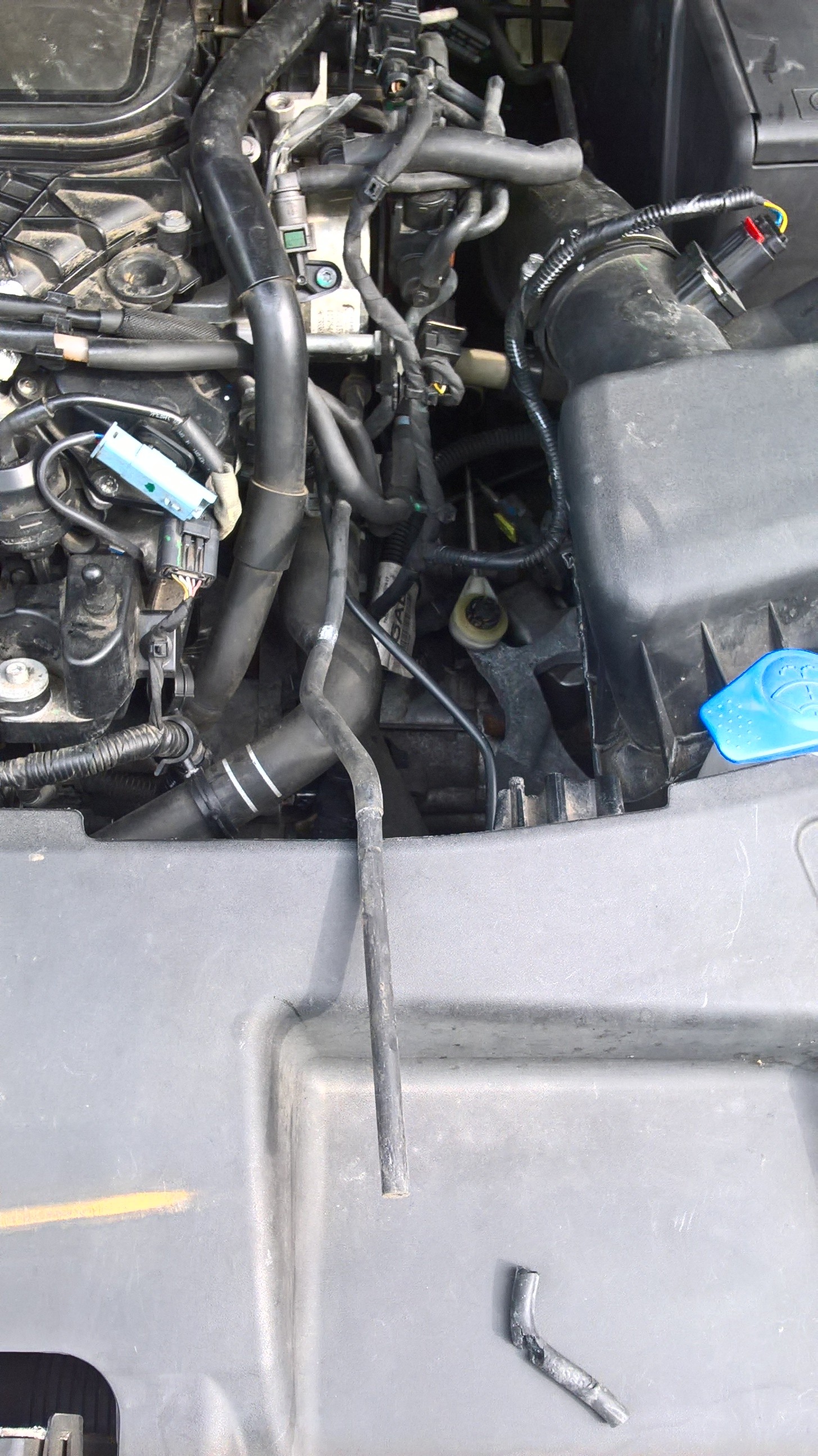 Bei der Suche nach weiteren Bissstellen ist mir ein Schlauch aufgefallen, der lose zwischen Getriebeglocke und Lüfter rumhängt. Also das Ende des Schlauchs endet in der Luft. Der Schlauch selbst kommt aus Richtung Hochdruckpumpe (Siehe Bild).