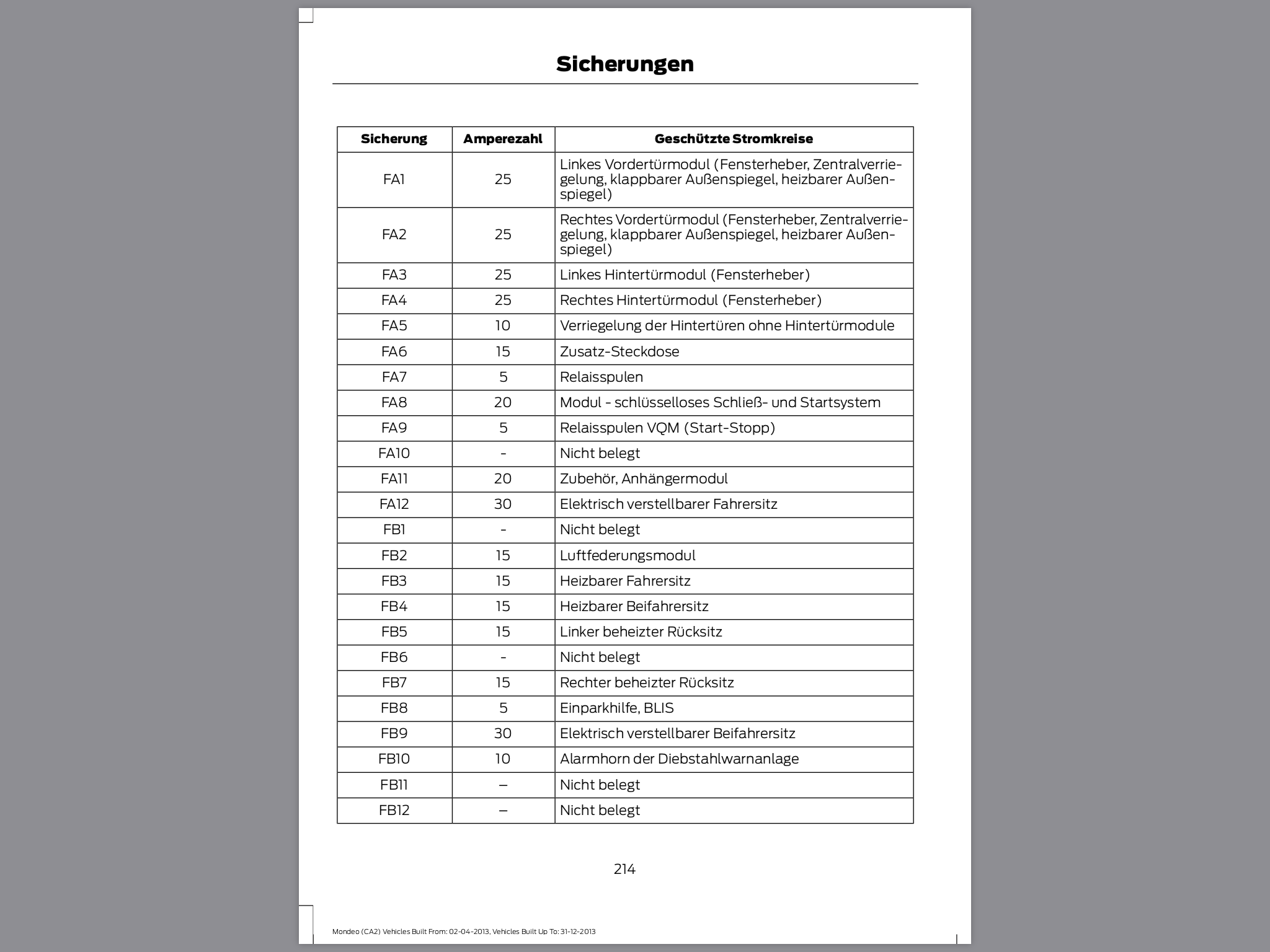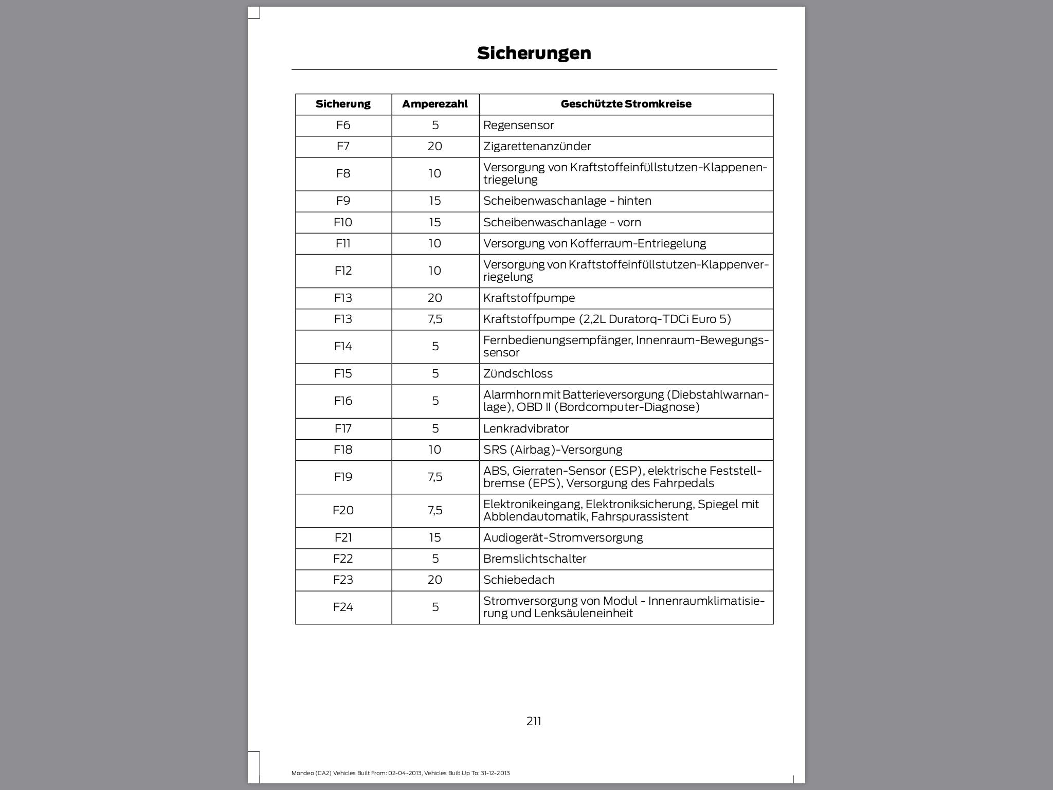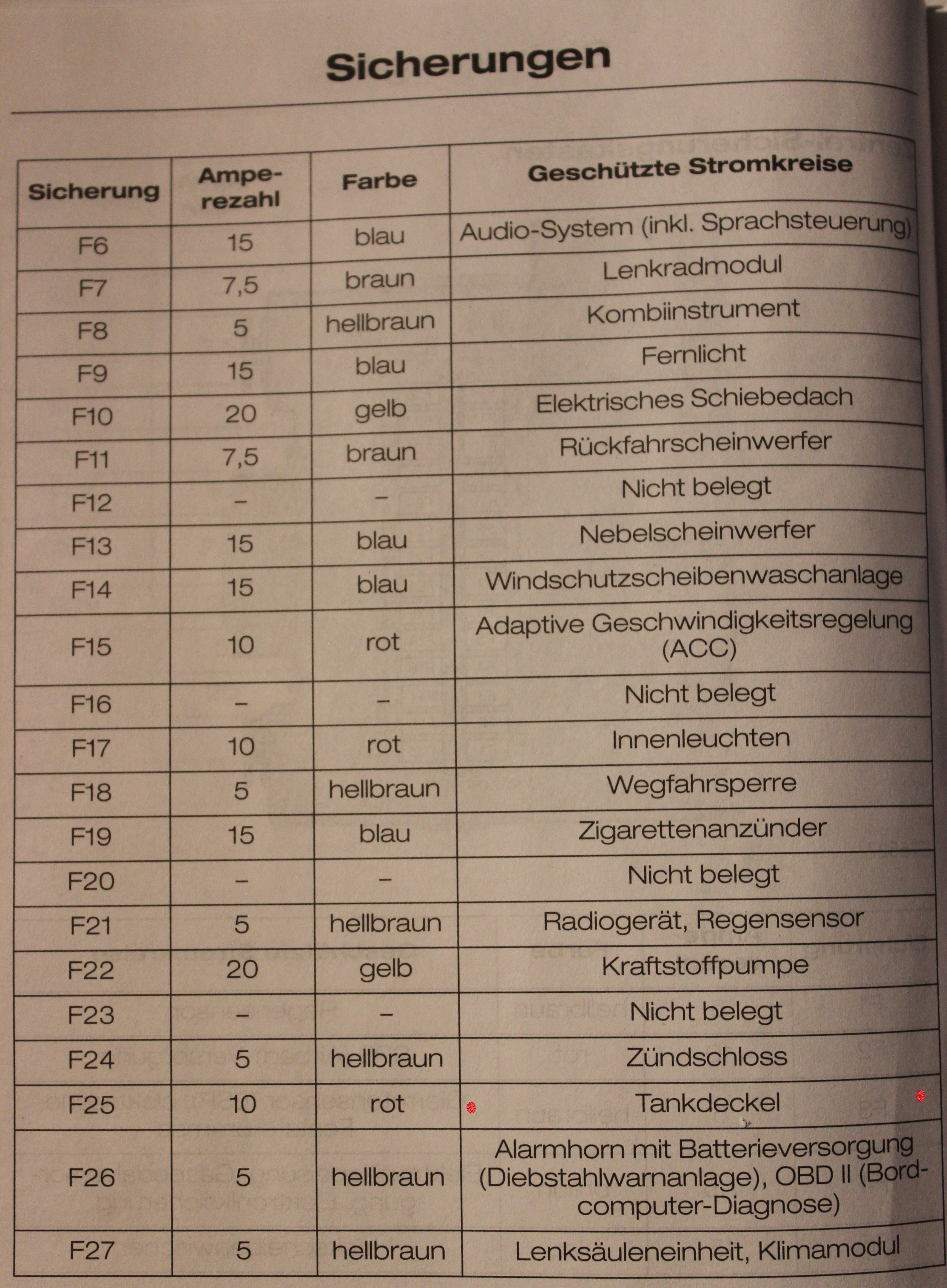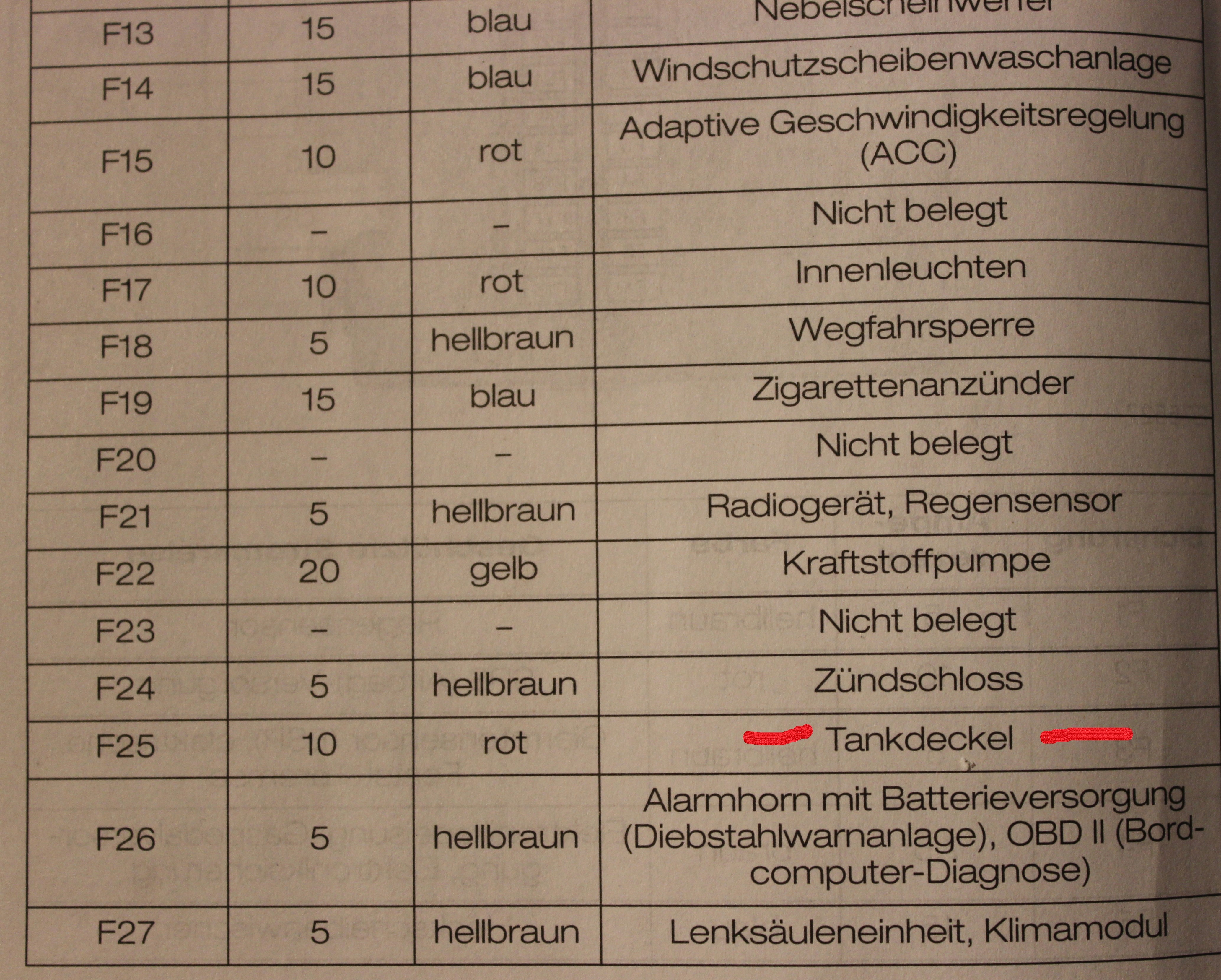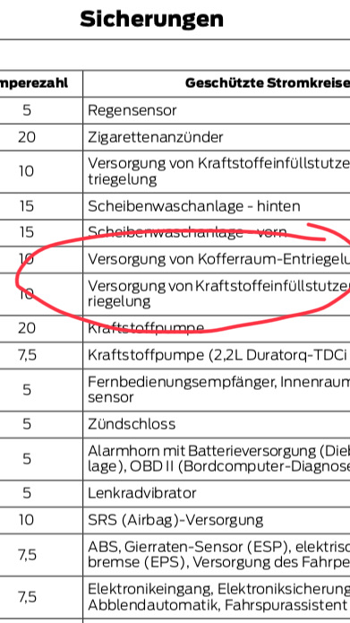 zurzeit renoviere ich meinen Mondeo Bauj.11.2007 hab mal alle Sicherungen mal so nur gecheckt und lese in der Bedienungsanleitung " Tankdeckel " ich hab keinen elektrischen Tankdeckel, also Sicherung gezogen, fertig, am nächsten Tag wollte ich die Heckklappe öffnen, geht nicht mehr, dachte und nun, da viel mir ein, Sicherung gezogen, die Sicherung wieder rein und geht wieder.