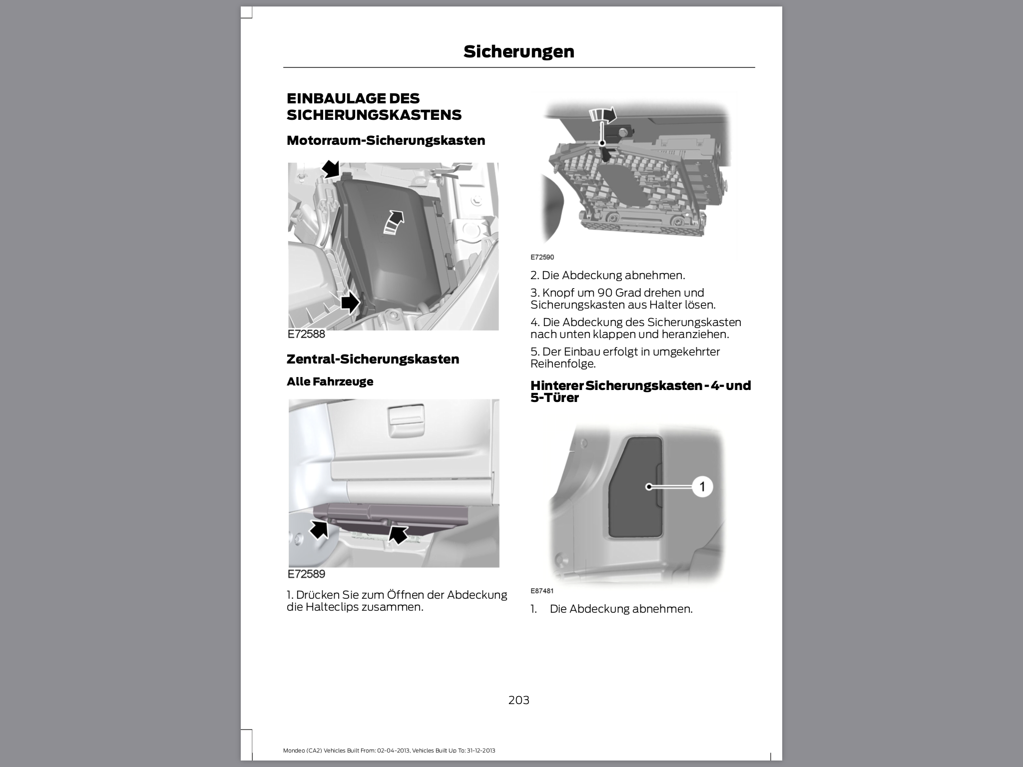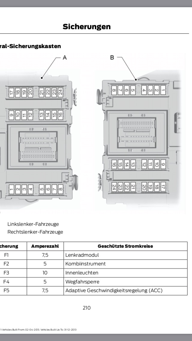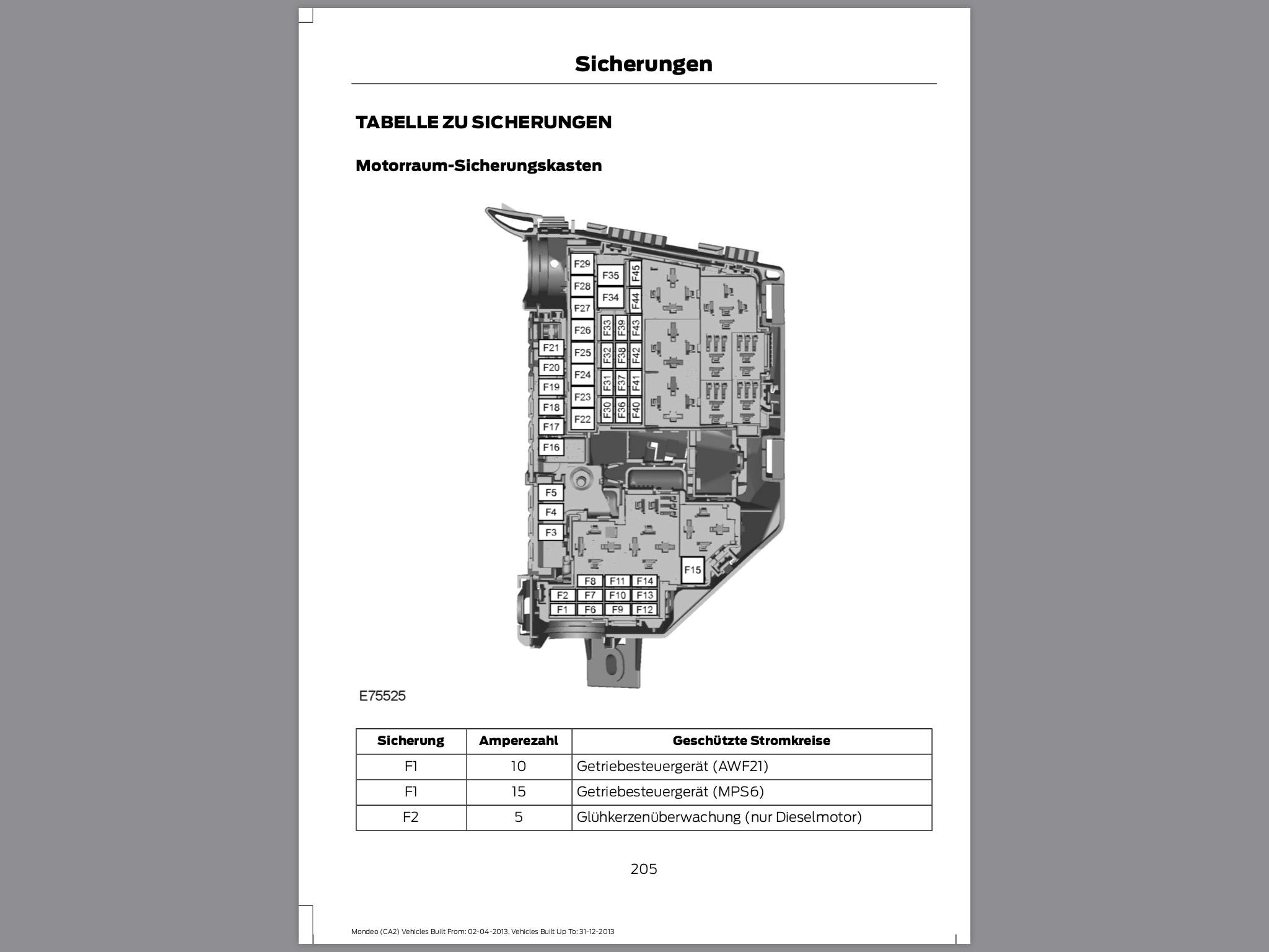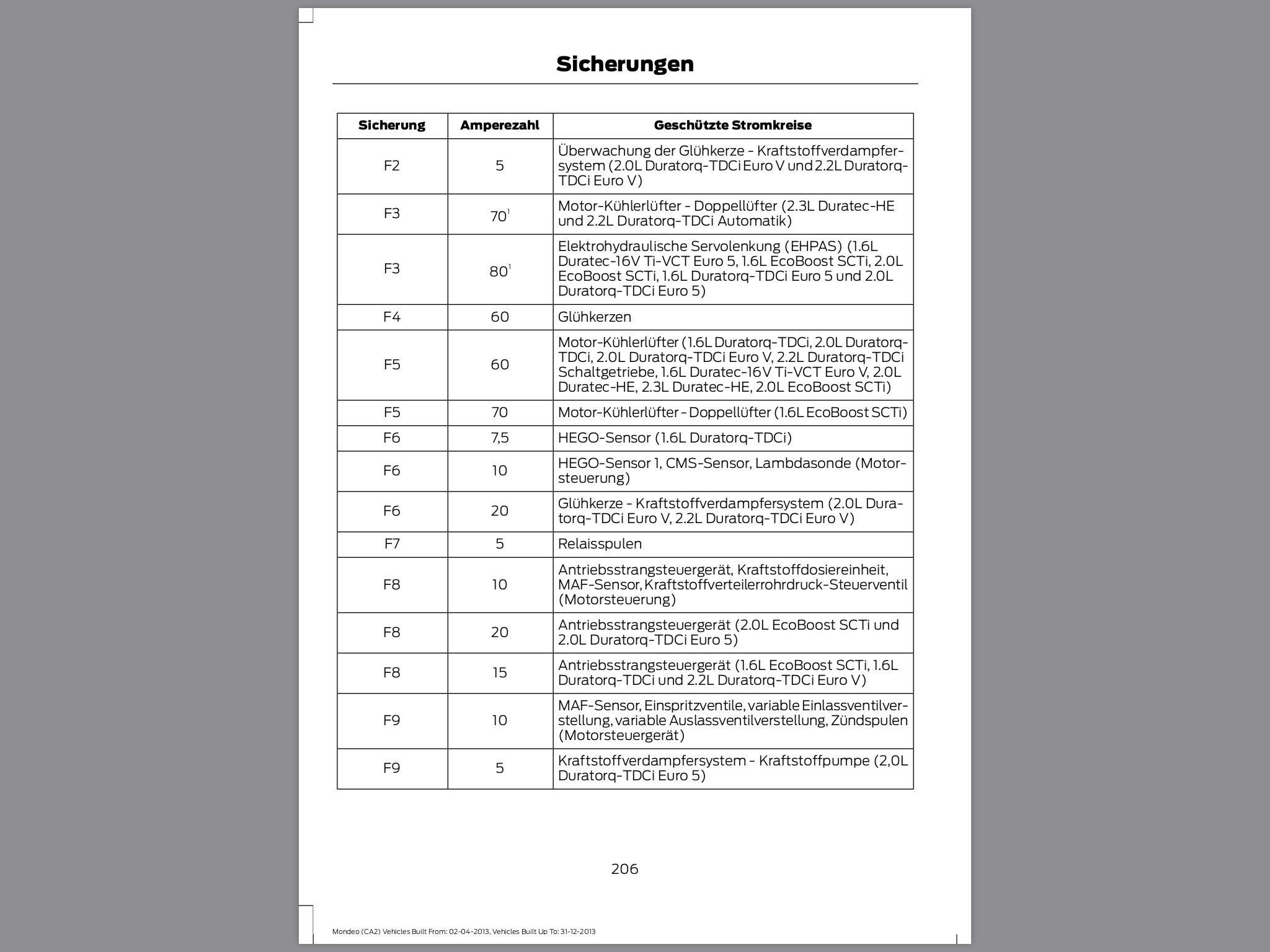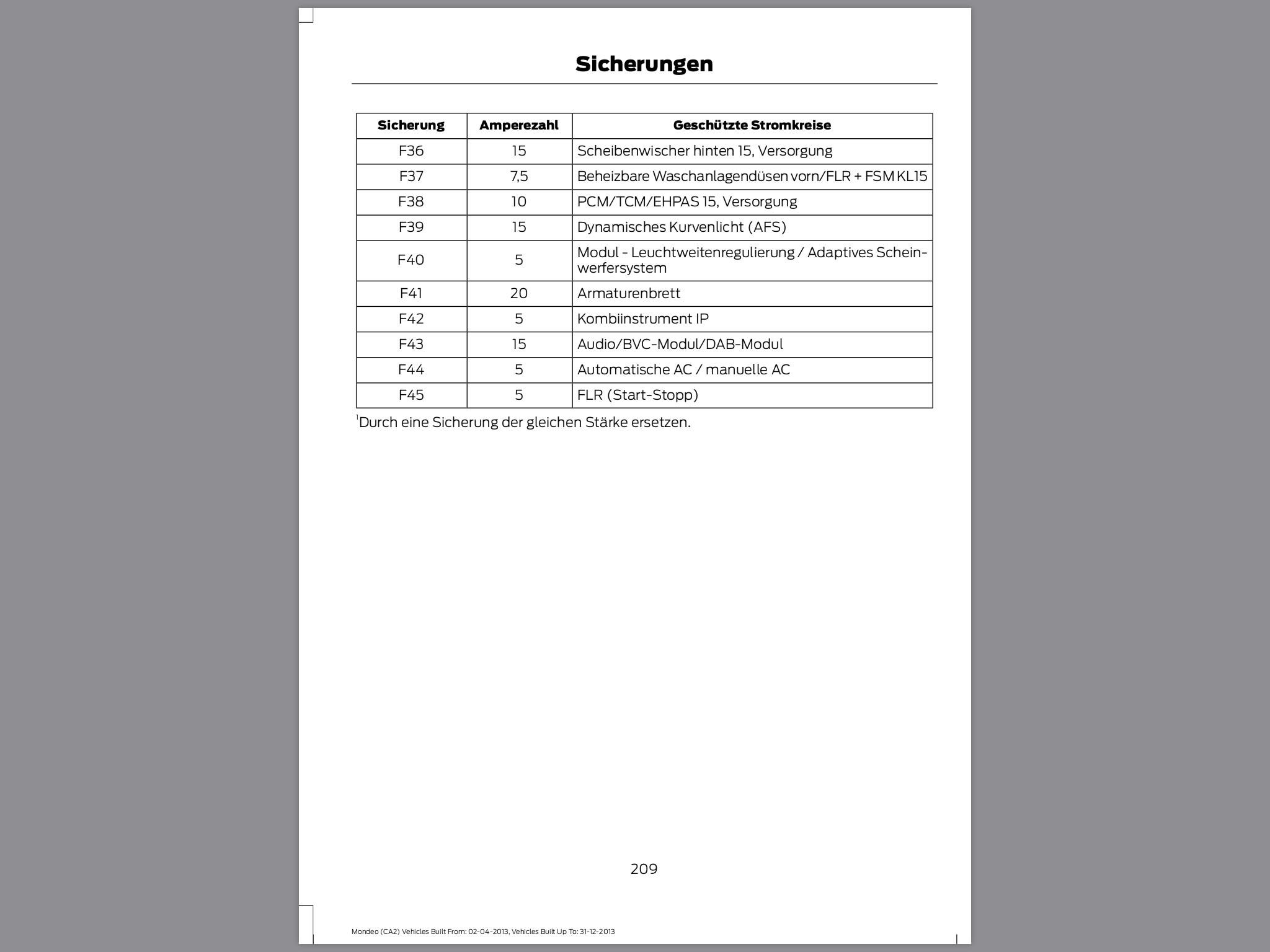 zurzeit renoviere ich meinen Mondeo Bauj.11.2007 hab mal alle Sicherungen mal so nur gecheckt und lese in der Bedienungsanleitung " Tankdeckel " ich hab keinen elektrischen Tankdeckel, also Sicherung gezogen, fertig, am nächsten Tag wollte ich die Heckklappe öffnen, geht nicht mehr, dachte und nun, da viel mir ein, Sicherung gezogen, die Sicherung wieder rein und geht wieder.