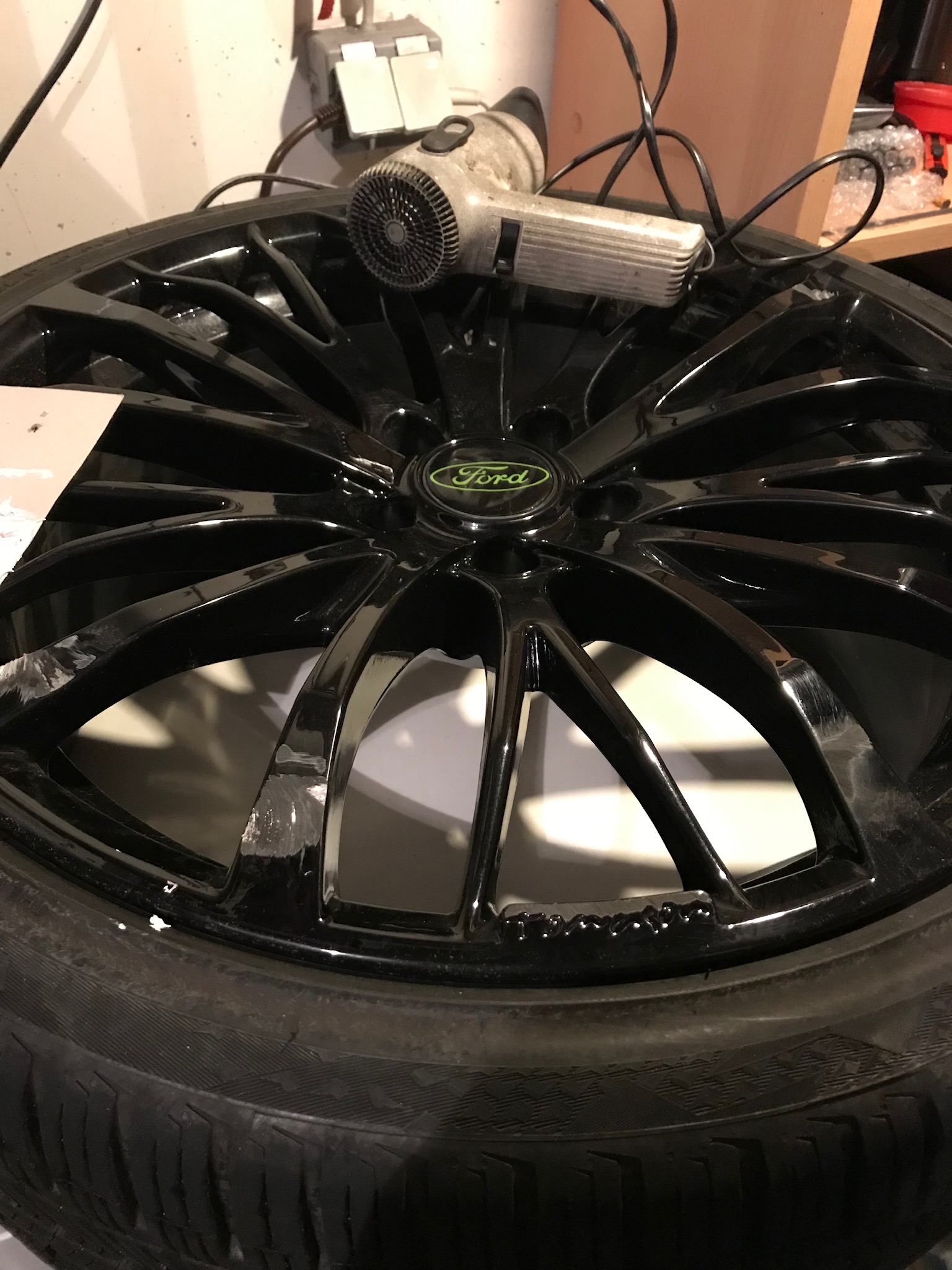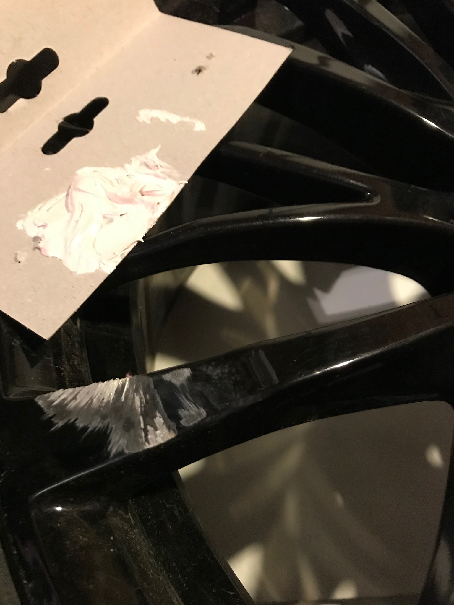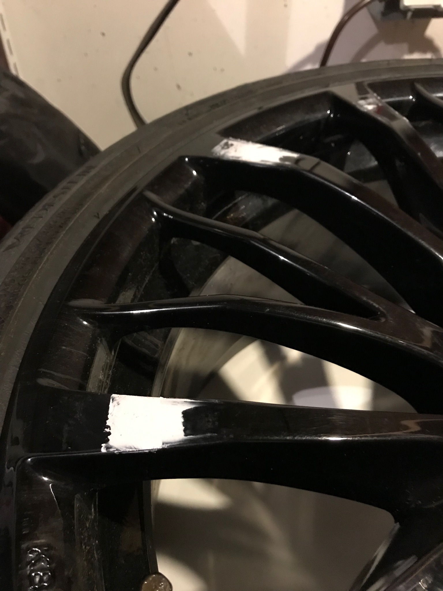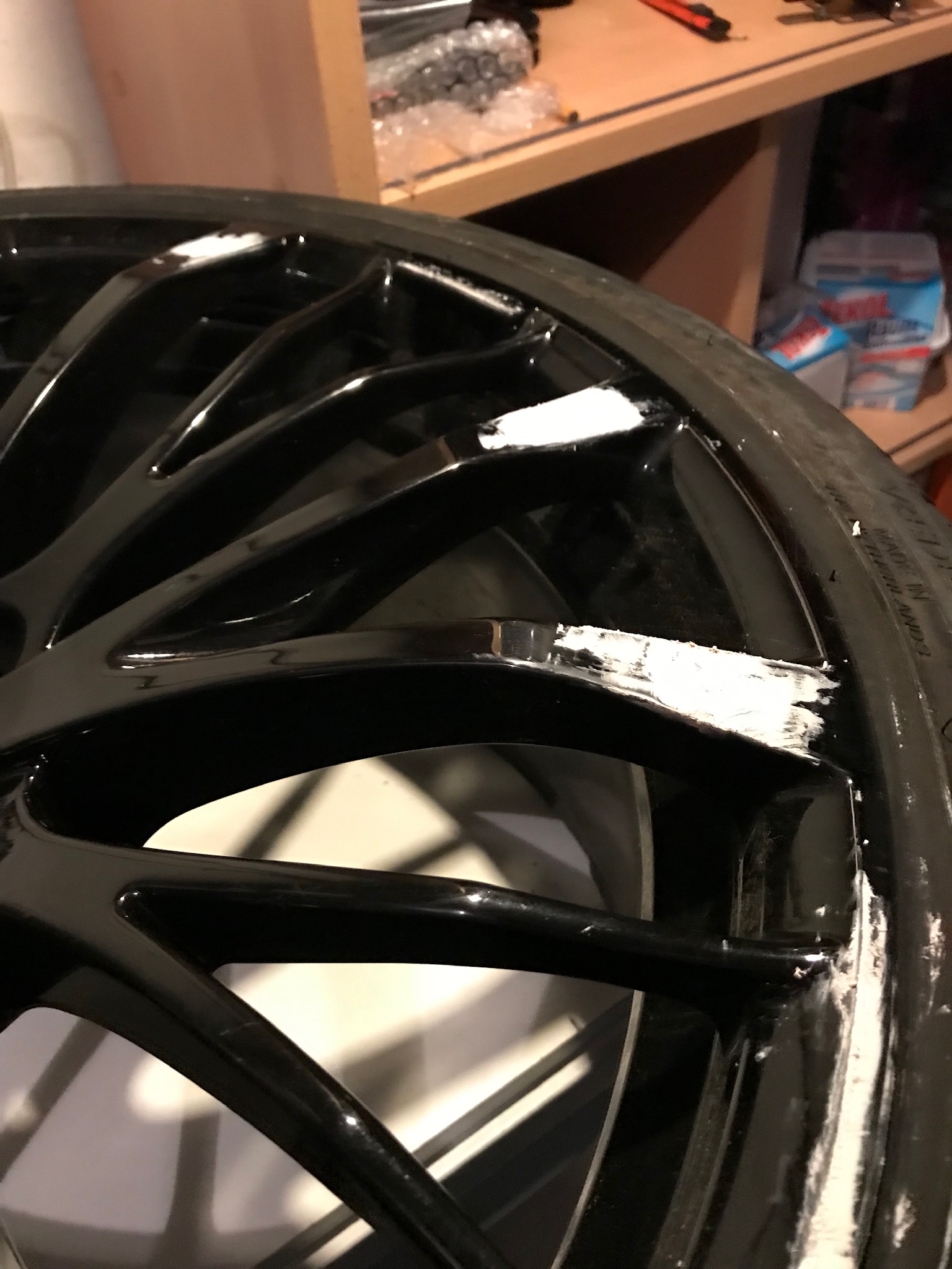 . Schweller an der Unterseite zerkratzt und die Felge einen schönen Schlag abbekommen. Zwischen Felge und Reifen auch noch Betonreste. Zu Hause das Rad abgeschraubt und Luft raus. Dann zwischen Reifen und Felge Holzkeile eingeschlagen. Steinchen raus und dann die Feile angesetzt. Noch schön Feinspachtel auf Epoxidharzbasis angerührt und dann Feinschliff. Am Spoiler das gleiche. Und dann noch Lack. Gegen Mitternacht war ich fertig.