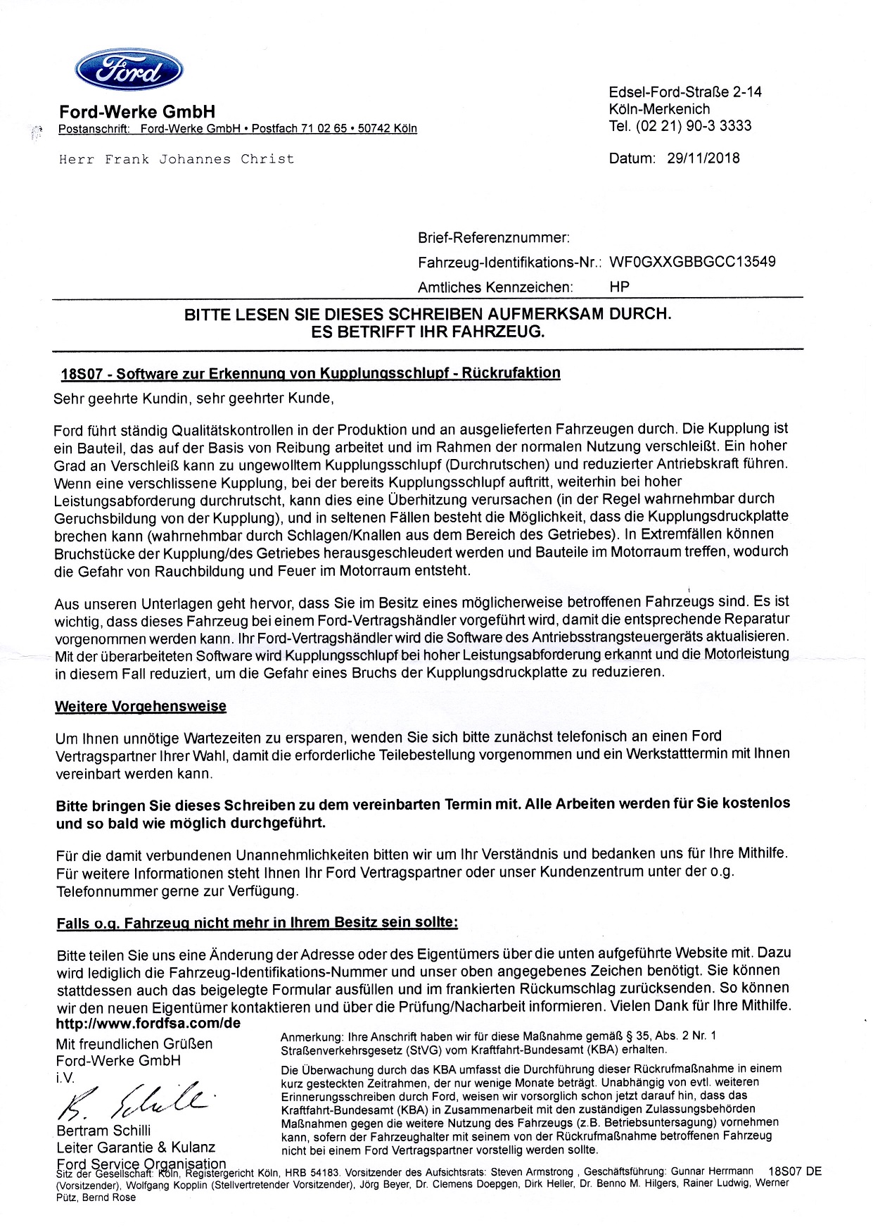 Als ich meinen Händler anrief, war der recht überrascht, dass der Mondeo in dem Bauzeitraum von dieser Rückrufaktion betroffen ist.