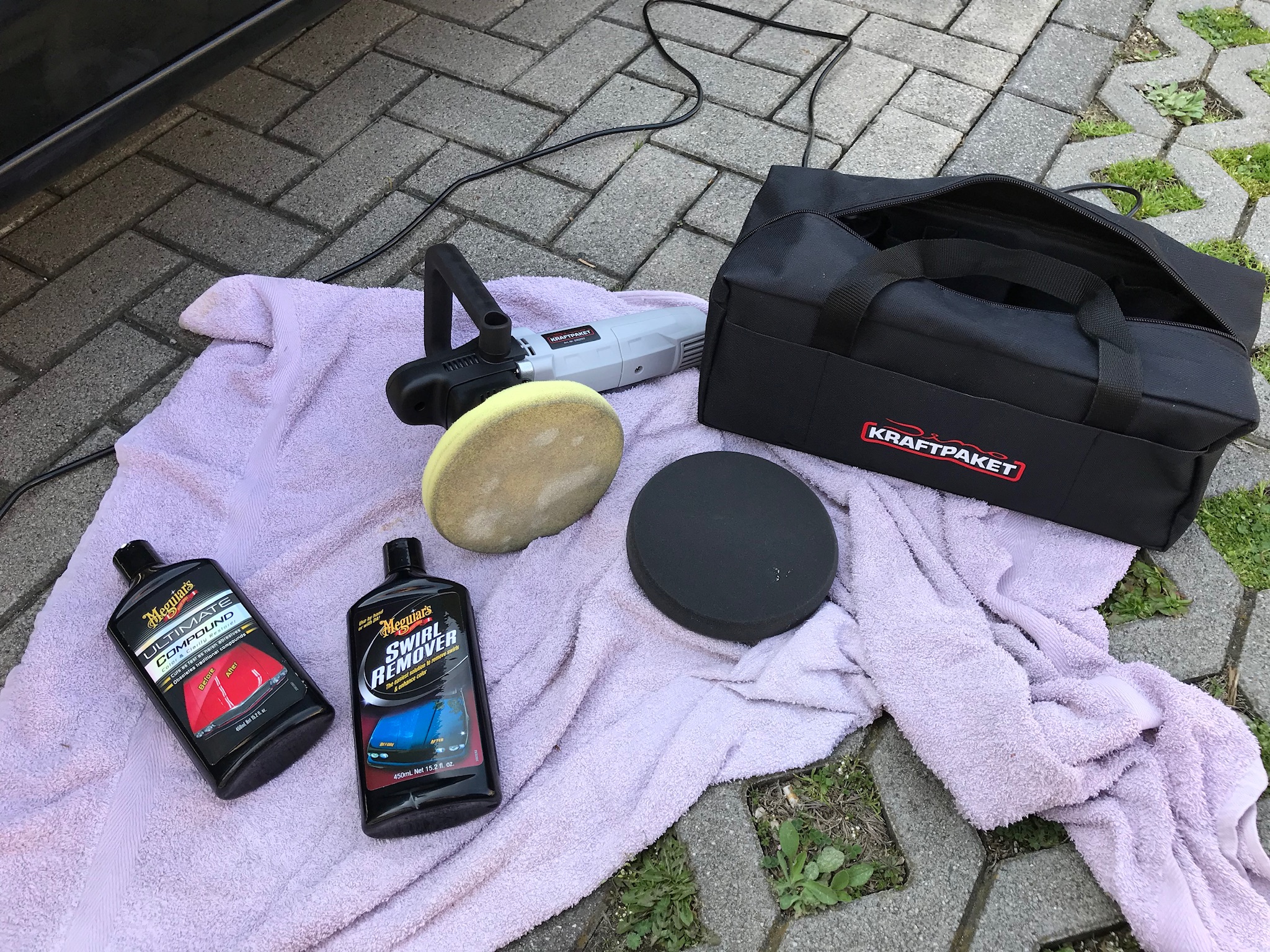 Es war soweit. Winter der keiner war, ist vorbei, also Frühjahrsputz. Da ich auf Handpolitur kein Bock mehr hatte mußte eine Poliermaschine her. Also das www durchsucht, Videos geschaut, Kundenrezensionen gelesen und dann fiel die Entscheidung. Es sollte von der Firma Kraftpaket die kleine Dino werden. Knapp 2kg schwer, eine Exzenterpoliermaschine, Drehzahl einstellbar, 5m Kabel, schöne Tasche und 2 Polierpads. Schnell noch, als MeguiarsFan, 2 Polituren gekauft, einen Swirl Remover und ein Ultimate Compound.