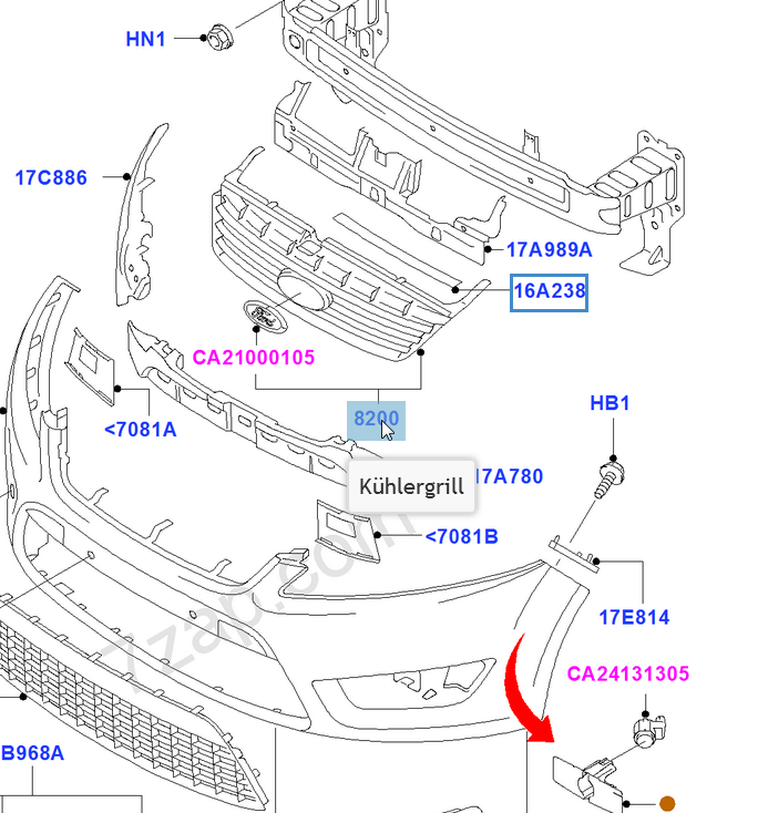 Der Plastikdübel ("nutzt nichts") ist vom oberen Kühlergrill. Die "???" zeigen auf keine Schraube. An der Stelle ist der Kühlergrill in der Stoßstangenschürze verclipst,