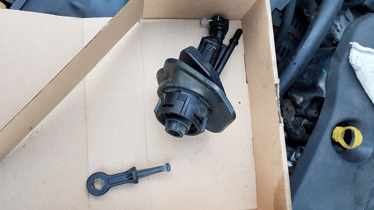 Seit kurzem hatte ich ein seltsames Knacken im Kupplungspedal und dabei einen seltsamen "Druckpunkt" nach wenigen cm. Ausserdem stand das Pedal wesentlich höher als Bremse und Gaspedal. Beim Versuch zu entlüften konnte ich nicht über den Vorratsbehälter entlüften, es ging nur vom Entlüftungsventil aus und auch nur mit höherem Druck (4 bar, pneumatisches Entlüftunsggerät). Nach 2-3 Tagen hatte die Kupplung kaum noch Pedalweg und das Pedal kam auch nicht wieder zurück. Also habe ich mir einen Geberzylinder gekauft und am Samstag gewechselt.