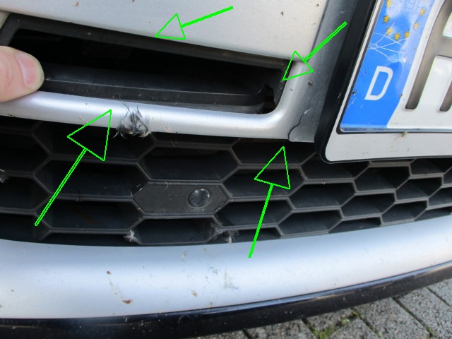 -In diesem Teil ist auch ein Schlitz, welcher auch gebrochen scheint, denn man kann ihn nach innen drücken. Sieht man auf dem Foto mit dem Finger (Gehört das zum unteren Kühlergrill?)