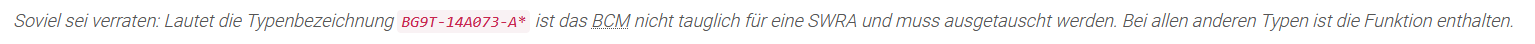 BG9T-14A073-B* oder BG9T-14A073-C* als Hardware-Typ vermerkt (der *-A* Version fehlt die Ansteuermöglichkeit für die SWRA)