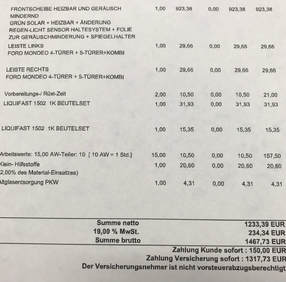 Also klar war das mit neuer Scheibe. Die Einzelheiten von der Rechnung weiß ich nicht mehr. Ich weiß wohl das der Tausch vom Fiesta zum mondeo 1k Unterschied macht.