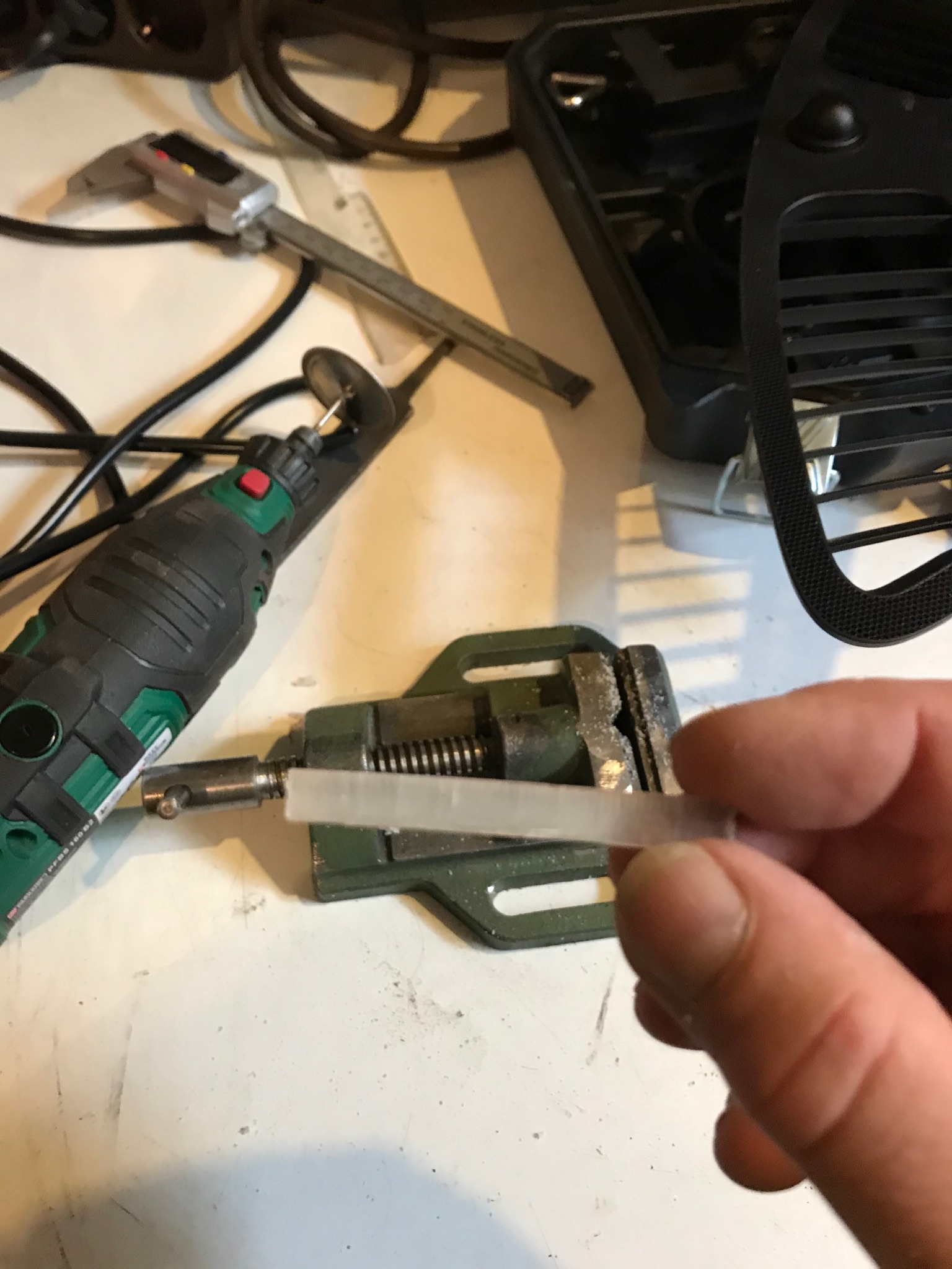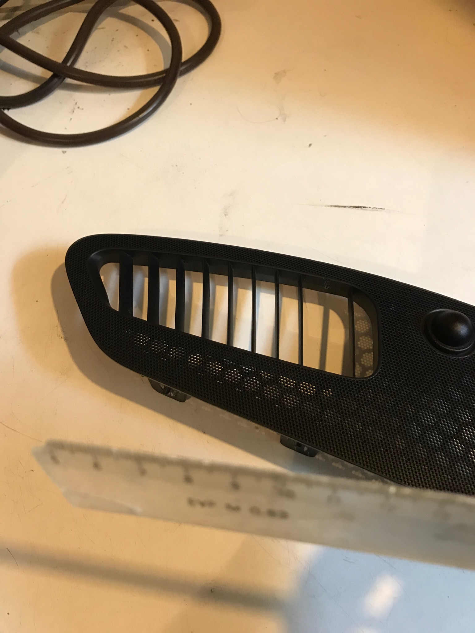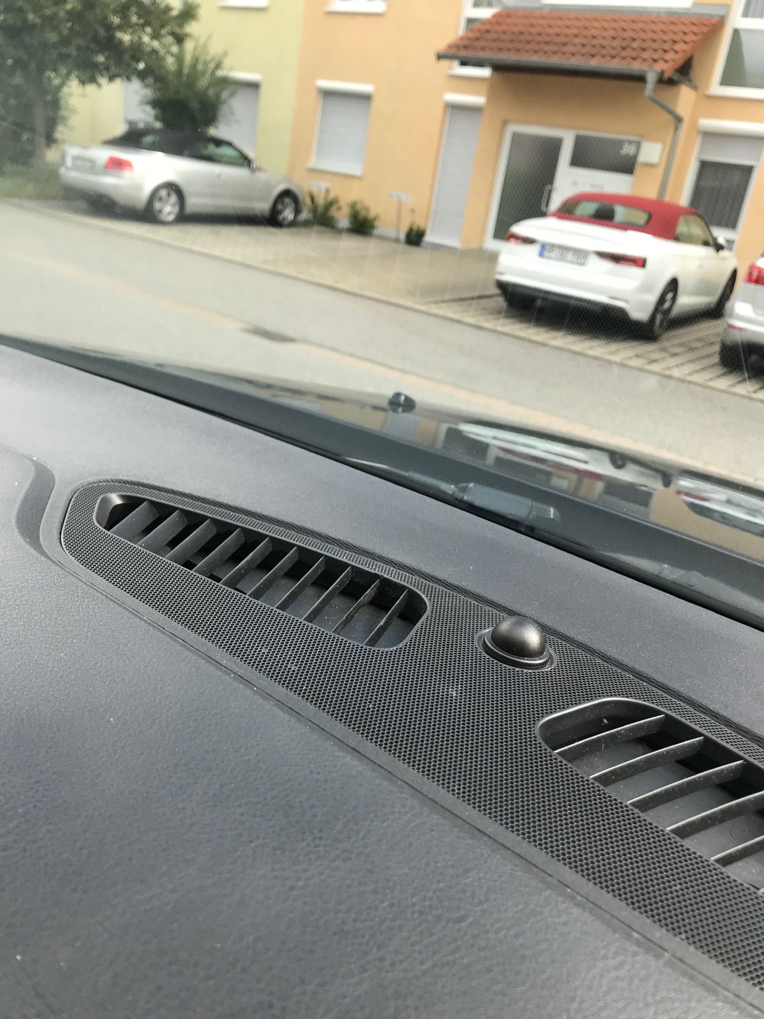 Da habe ich eine neue Scheibe eingebaut bekommen und was mußte ich feststellen? Es fehlte eine Strebe im Lüftungsgitter auf dem Armaturenbrett. Wo war sie nur? Naja jetzt im Nachhinein kann ich da auch nix mehr machen, also mußte eine Bastellösung her. Neu kaufen kam nicht in Frage. Und in der Bucht gab es nur die Gitter aus dem VFL, die ja die Spiegelungsproblematik in der Frontscheibe hatten. Also mal die ganze Wohnung abgegrast nach etwas zum „ umstricken „. Und da bin ich doch auf ein altes Plastiklineal aus meiner Schulzeit gestoßen. Die Oberseite mit der Zahlenskala war fast baugleich der fehlenden Strebe. Die war nämlich unten breiter und nach oben hin schmaler zulaufend. Schnell den Dremel rausgeholt. Alles angepasst, geschliffen, mattschwarz lackiert und mit Sekundenkleber eingefügt.